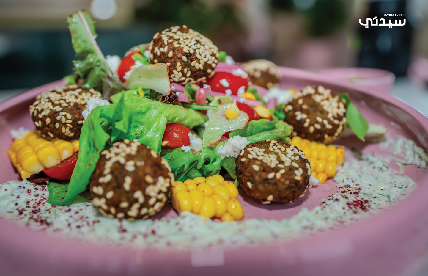 - ضعي مزيج السلطة، ووزِّعي الفلافل الساخنة فوقها، واسحقي جبنة الفيتا، وزيِّني بالسمسم الأبيض، ورشِّي السماق.