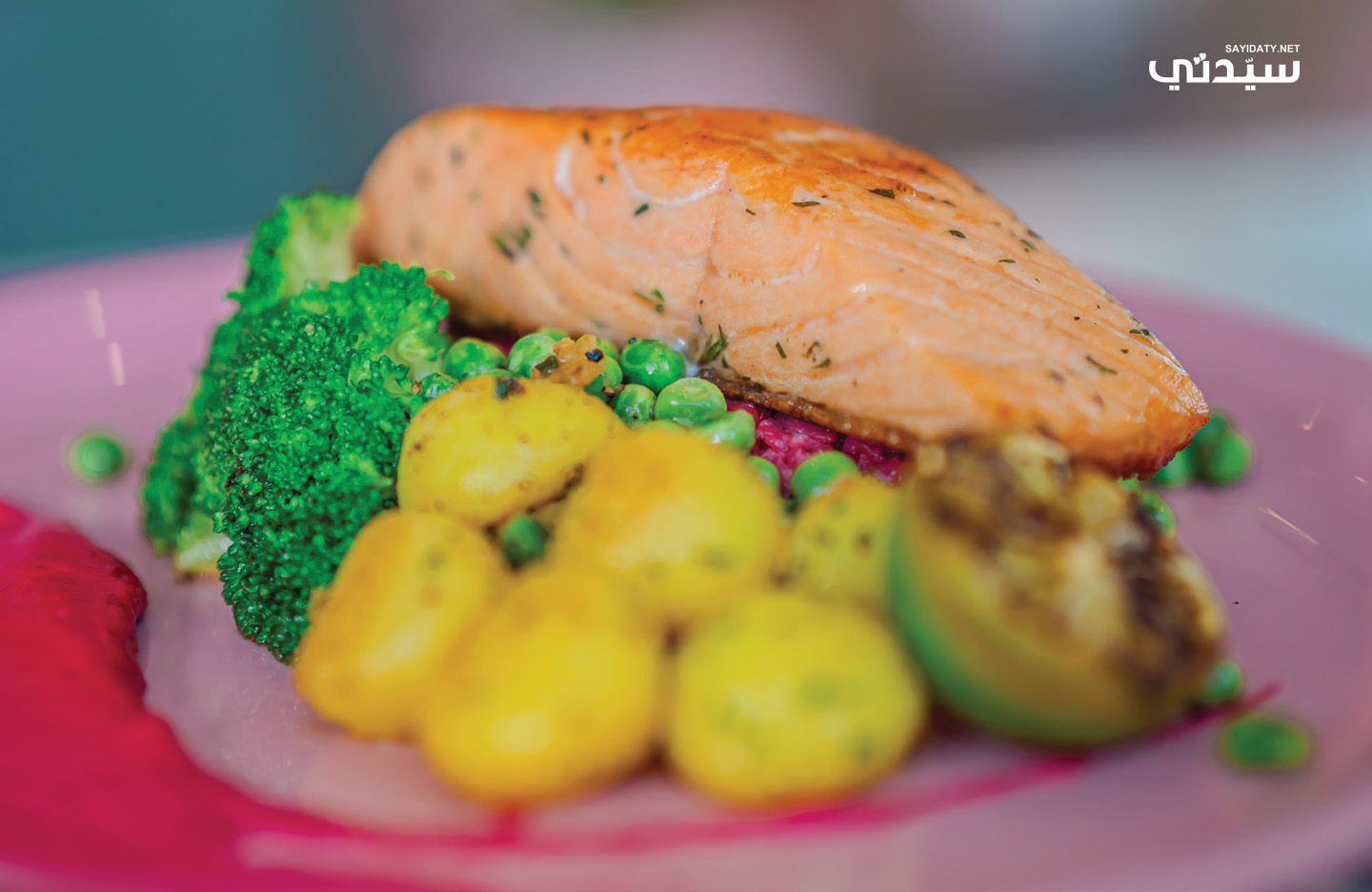 - رتّبي البطاطا المشوية، والبروكلي، والبازلاء الخضراء حول السمك، وأضيفي الليمون المشوي على الجانب للتزيين.