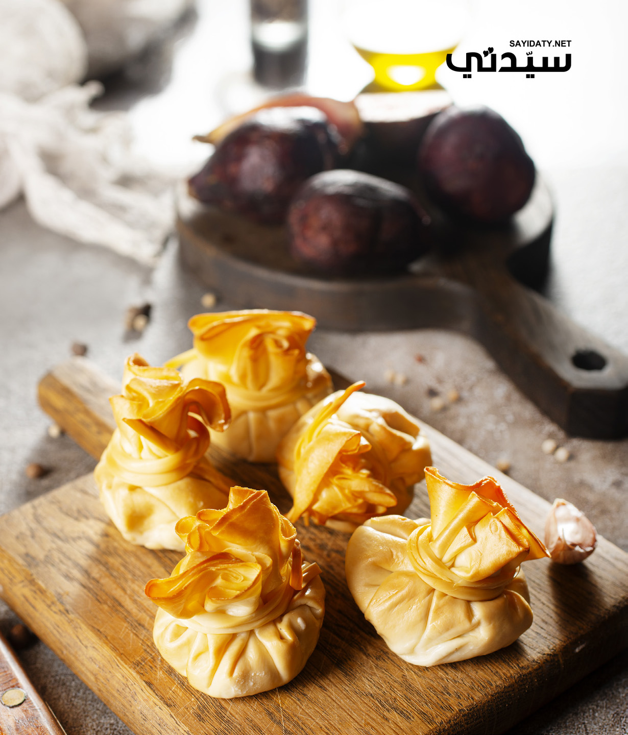 • ضعي مقدار ملعقتين من الحشوة في المنتصف، واجمعي أطراف الورقة نحو الأعلى لتكوين شكل كيسٍ، أو وردةٍ، واربطيها بخيط طعامٍ، أو عود بصلٍ رفيعٍ.