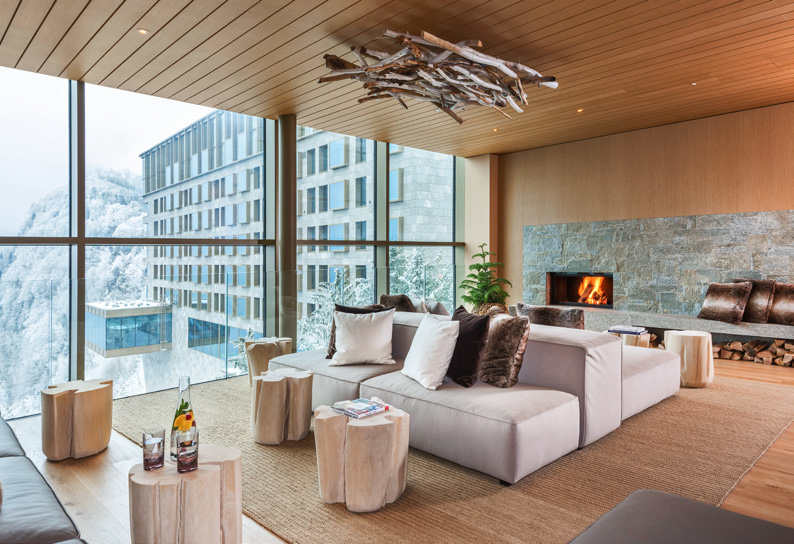 وهذه الغرفةُ، هي إحدى الغرفِ الـ 360 الموزَّعةِ على ثلاثةِ فنادقَ، أوَّلُها فندقُ بورجنشتوك وسبا الألب الذي يُوفِّر خيارَين مميَّزَين للإقامة: الفندقُ «المعاصر»، وفندقُ «الهريتدج»، وهناك أيضاً فندقُ «والدهوتيل باي بورجنشتوك»، ونزلُ «تافرن 1879»: الكوخُ السويسري التقليدي على طرازِ الشاليه.
