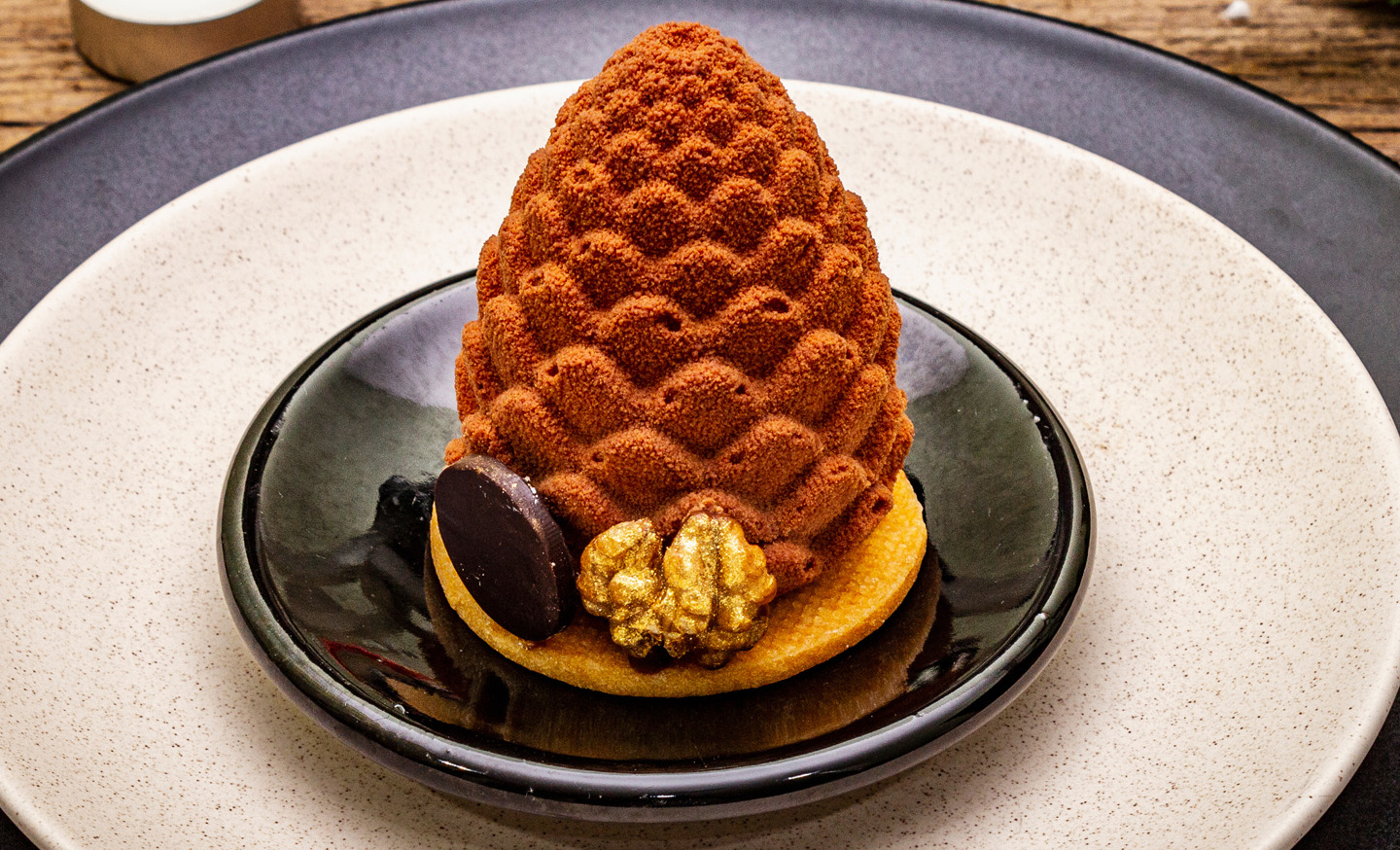 بالمظهرِ المخروطي "Pinecone Chocolate Mousse Dessert"، وهي حلوى فاخرةٌ، تُقدَّم في المطاعمِ الراقية، وتتكوَّنُ عادةً من موس الشوكولاتة، أو الكراميل المملَّح المُشكَّل في قالبٍ على شكلِ ثمرةِ صنوبر، والمغطَّى برذاذٍ مخملي "velvet spray" مع قاعدةٍ من الشوكولاتة، وقطعٍ من الجوزِ للزينة.