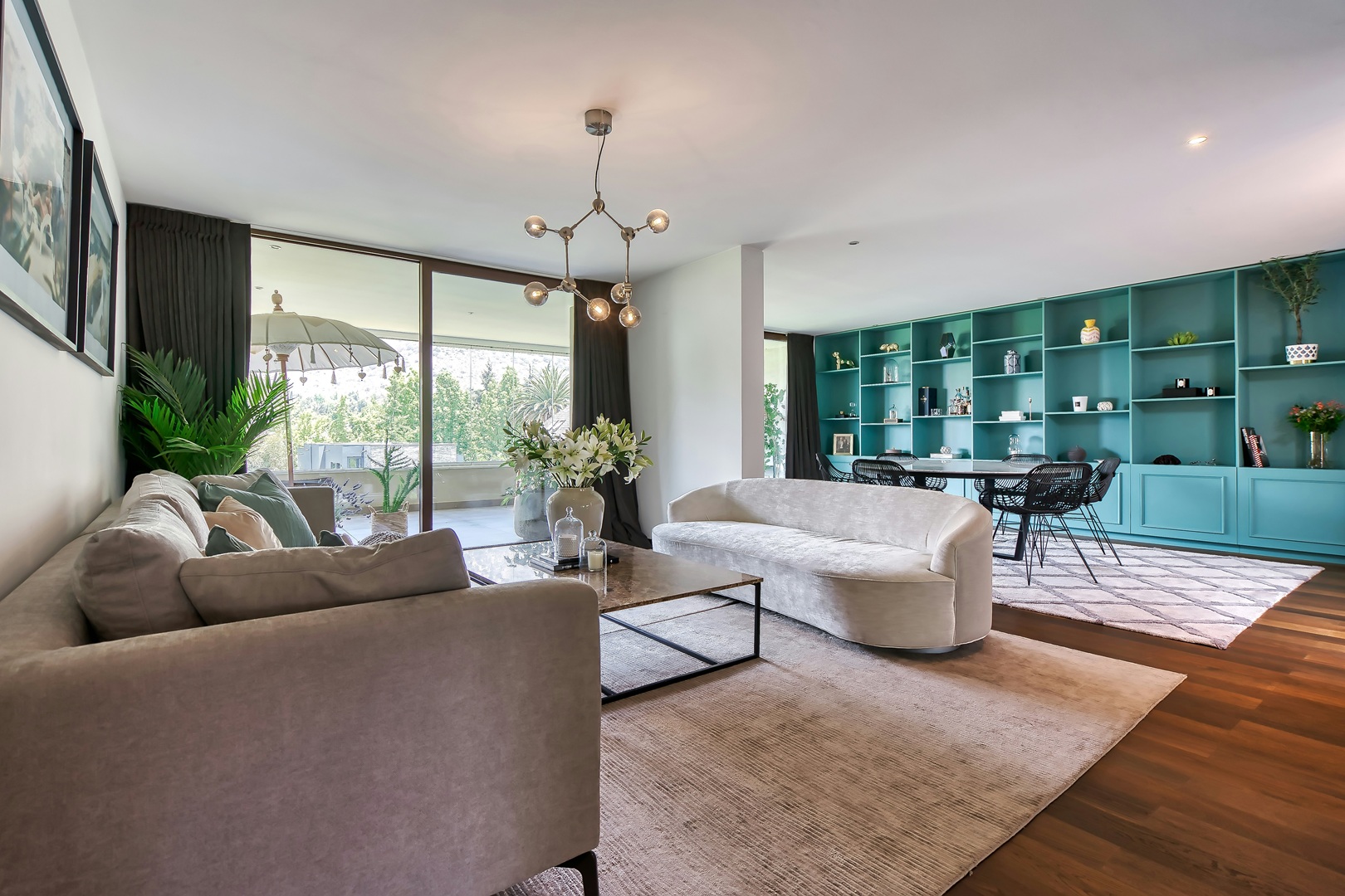 صالة استقبال منزلية مع سجادة واحدة تغطي كاما الأرضية تقريباً - يُؤثّر حجم السجادة على انسيابية الغرفة، لا سيما إذا كانت الأخيرة فسيحة، فالسجادة الكبيرة التي تفترش كل الأرضية تقريباً تحول المساحة كأنها مشهدٌ واحدٌ مُترابطٌ ودافئ. على العكس من ذلك، تحقق السجادات الصغيرة المتعددة مساحات مميزة تتنقل بينها العينان، أحياناً بصورة ممتعة وأحياناً أخرى بصورة مشتتة. لذلك، يقترح المصممون أن السجاد الكبير مناسب للحلول في المساحات المفتوحة بشكل أفضل، بينما تعدّد السجاد ذي الحجم الصغير، وفي حال إغفال التنسيق المدروس، يخلق فوضى متقطعة بدلاً من الانسجام.