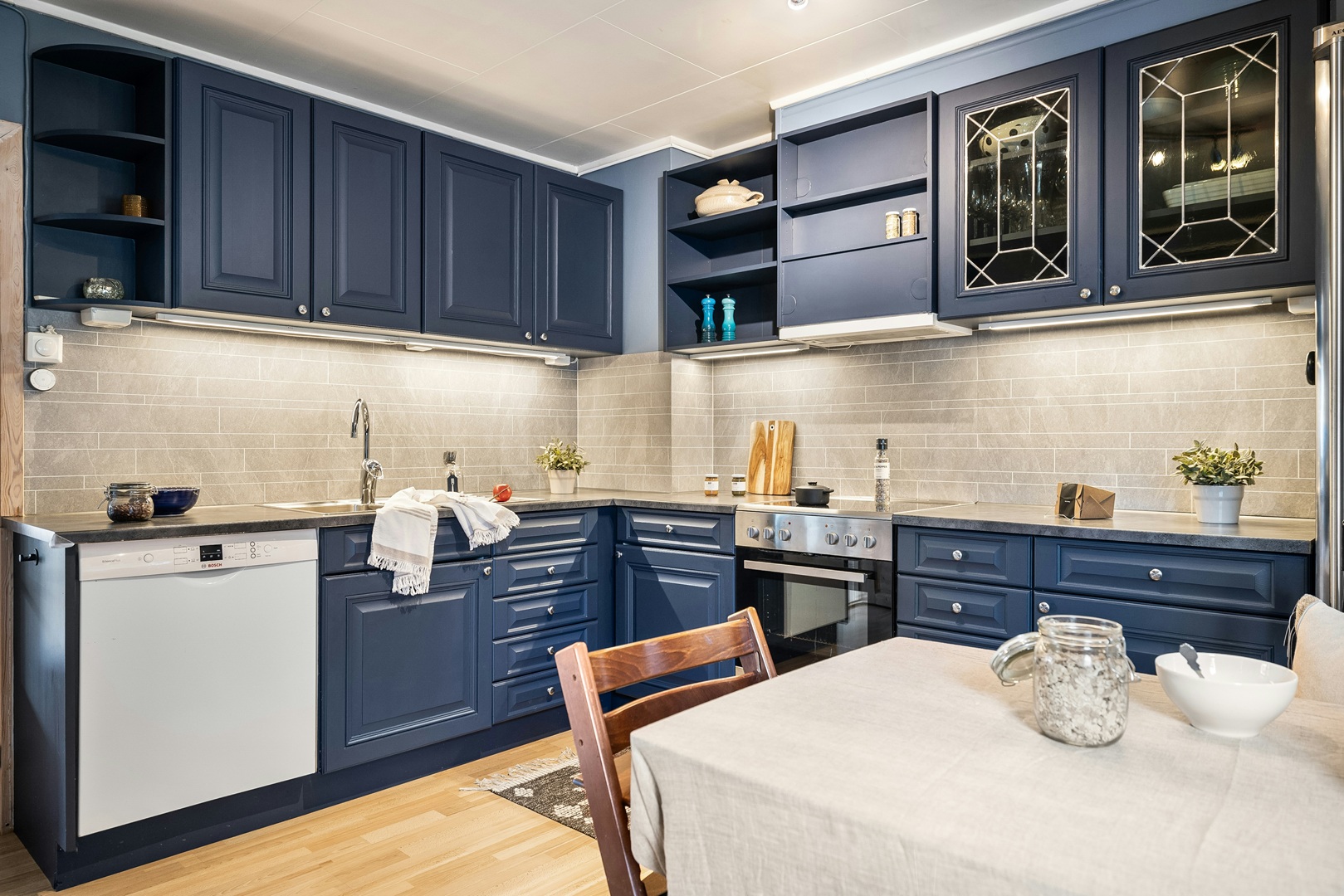 - أزرق مخضر غامق: يضيف اللون المذكور لمسةً مميزة إلى تصميم المطابخ، لا سيما للوحدات الأساسية، فهو أكثر جرأةً وتنوعاً، مقارنة بدرجات اللون الأخضر الأخرى.