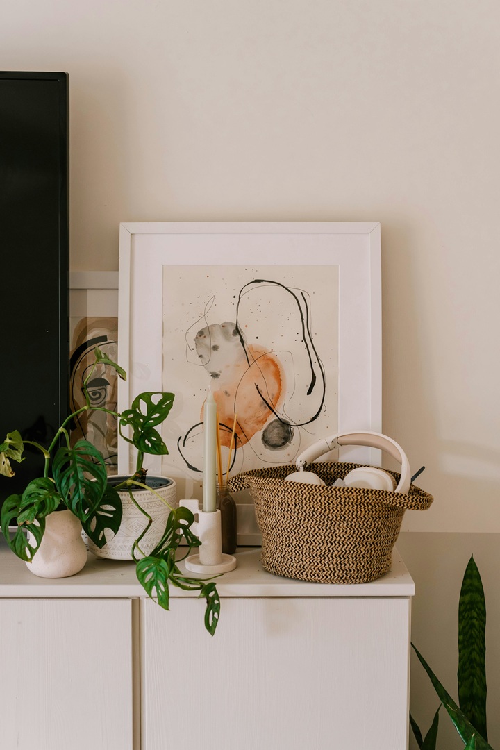 إضافة النباتات من أفضل أفكار تزيين طاولة التلفزيون في غرفة المعيشة؛ فنبتة صغيرة في أصيص متناسبة مع جو الشتاء حيث لا يدخل المنزل كمية وافرة من ضوء الشمس، أو حتى باقة من نبات البامباس المجفف، كلها تُضفي انتعاشاً فورياً على المكان. أما إذا لم تكن لديكِ خبرة في التعامل مع النباتات الطبيعية، يمكنكِ استخدام نباتات صناعية. أصيص أنيق أو سلة منسوجة تُضفي مزيداً من الجمال على طاولة التلفزيون.