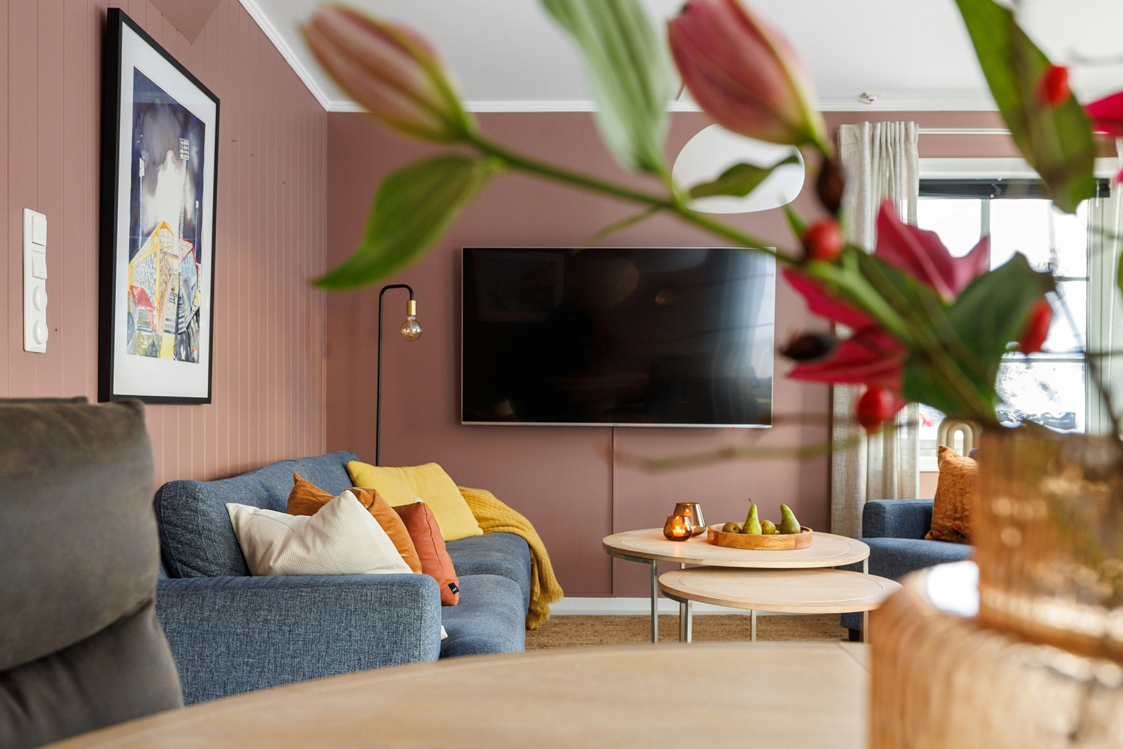 يُعدّ الجدار المميز نقطة جذب رائعة في غرفة المعيشة، فلماذا لا تجعلينه أكثر تأثيراً بتثبيت التلفزيون عليه؟ يُعدّ هذا النحو رائعاً، خاصةً إذا كان لديك جدار كبير خالٍ من أي عناصر أخرى. بالإضافة إلى ذلك، تُعدّ هذه حيلة رائعة لغرف المعيشة الصغيرة، إذ تُوفّر مساحة أرضية وتجعل الغرفة تبدو أقل ازدحاماً. ولإخفاء الأسلاك المزعجة، فكّري في استخدام غطاء للأسلاك أو حتى طلائها بنفس لون الحائط للحصول على مظهر متناسق. فكّري في استخدام ورق جدران مميز، أو طلاء، أو حتى جدار معرض فني مع إضافة سجادة أو تغيير وسائد الأريكة لتتناسب مع ألوان أو نقوش جدارك المميز.