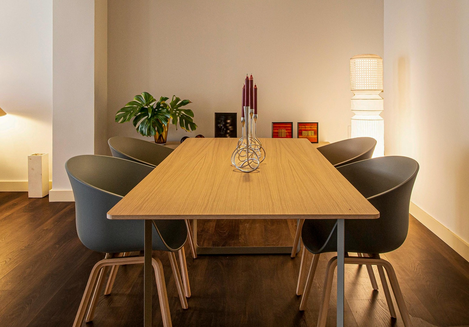 غرفة طعام منزلية مودرن مع أرضية داكنة وجدران بيضاء