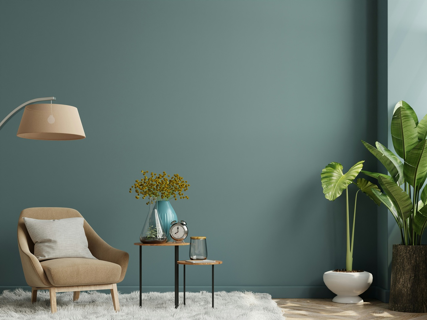- درجات الأزرق المخضر الهادئة: في حال الرغبة في إضافة المزيد من الألوان إلى غرفة المعيشة بمنزلك، راهناً، فكّري في اللون الأزرق المخضرّ، فهو مزيج رائع بين الأزرق والأخضر، يجمع بين الهدوء والجرأة في آنٍ واحد، ويبدو أكثر عصرية مقارنة بـطلاء الجدران بالأخضر الداكن. فالأزرق المخضرّ، يتصف بأنه غامض وهادئ وساكن، ويُضفي لمسة راقية. من جهة ثانية، يشكل طلاء الجدران المذكور خلفية رائعة لإضافة طبقات من النقوش والألوان المميزة إلى الغرفة. في هذا الإطار، تتناغم درجات الكراميل الدافئة بشكل رائع مع الجدران ذات اللون الأزرق المخضر.