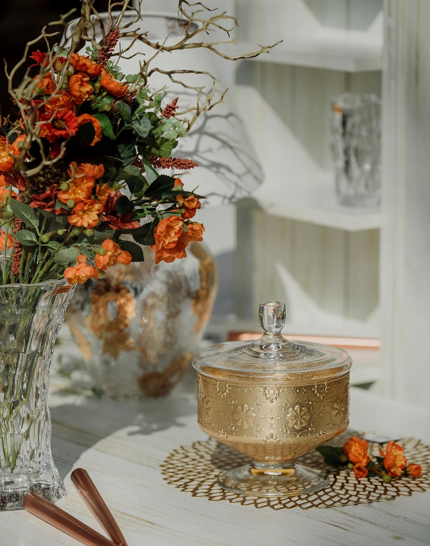 يرمز اللون الذهبي إلى جوّ احتفالي، ولكن الاعتدال في توظيف اللون هو الأساس. يتجلى ذلك من خلال تفاصيل ذهبية أنيقة تضاف إلى المجلس، متمثلة في: