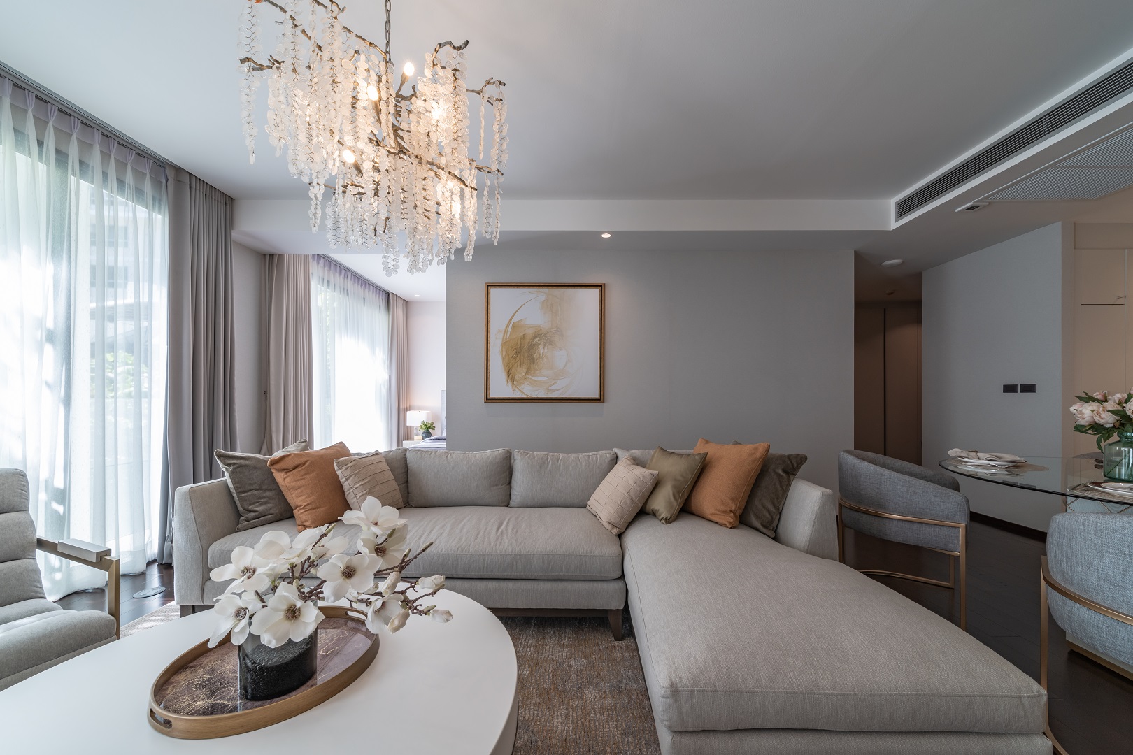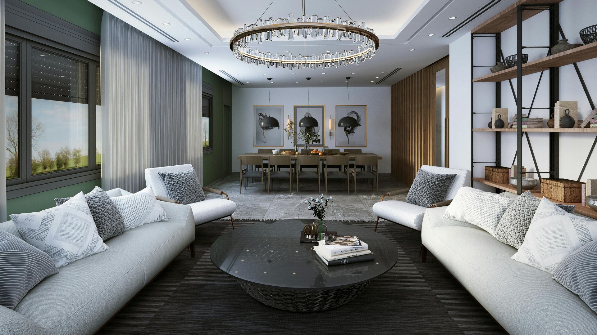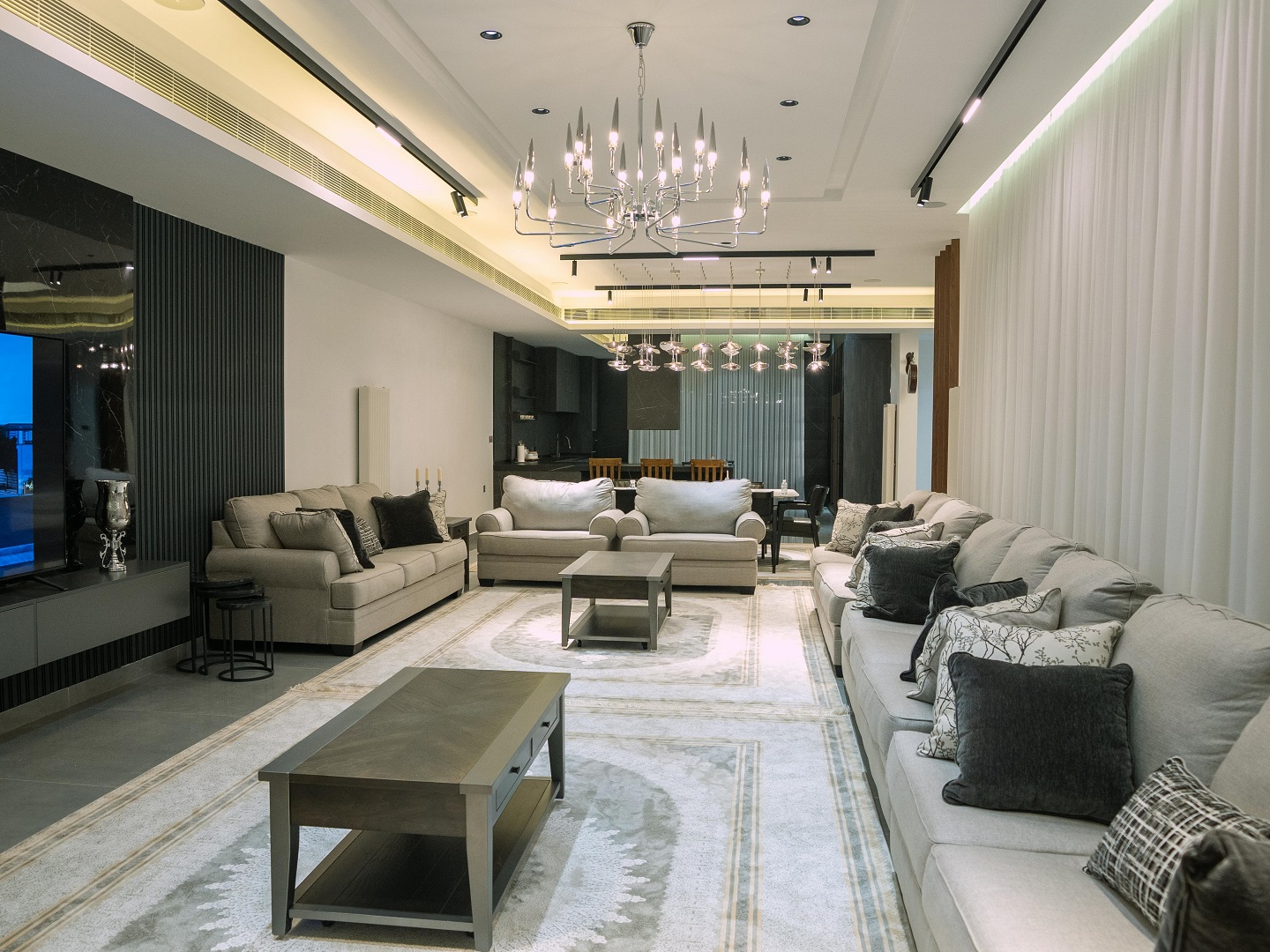 - خَيارات أثاث متعددة الاستخدامات تشمل: طاولة القهوة المزودة بوحدات تخزين مدمجة، أو تلك القابلة للرفع إلى مستوى طاولة الطعام؛ فهذه المرونة مثالية للتجمعات.
