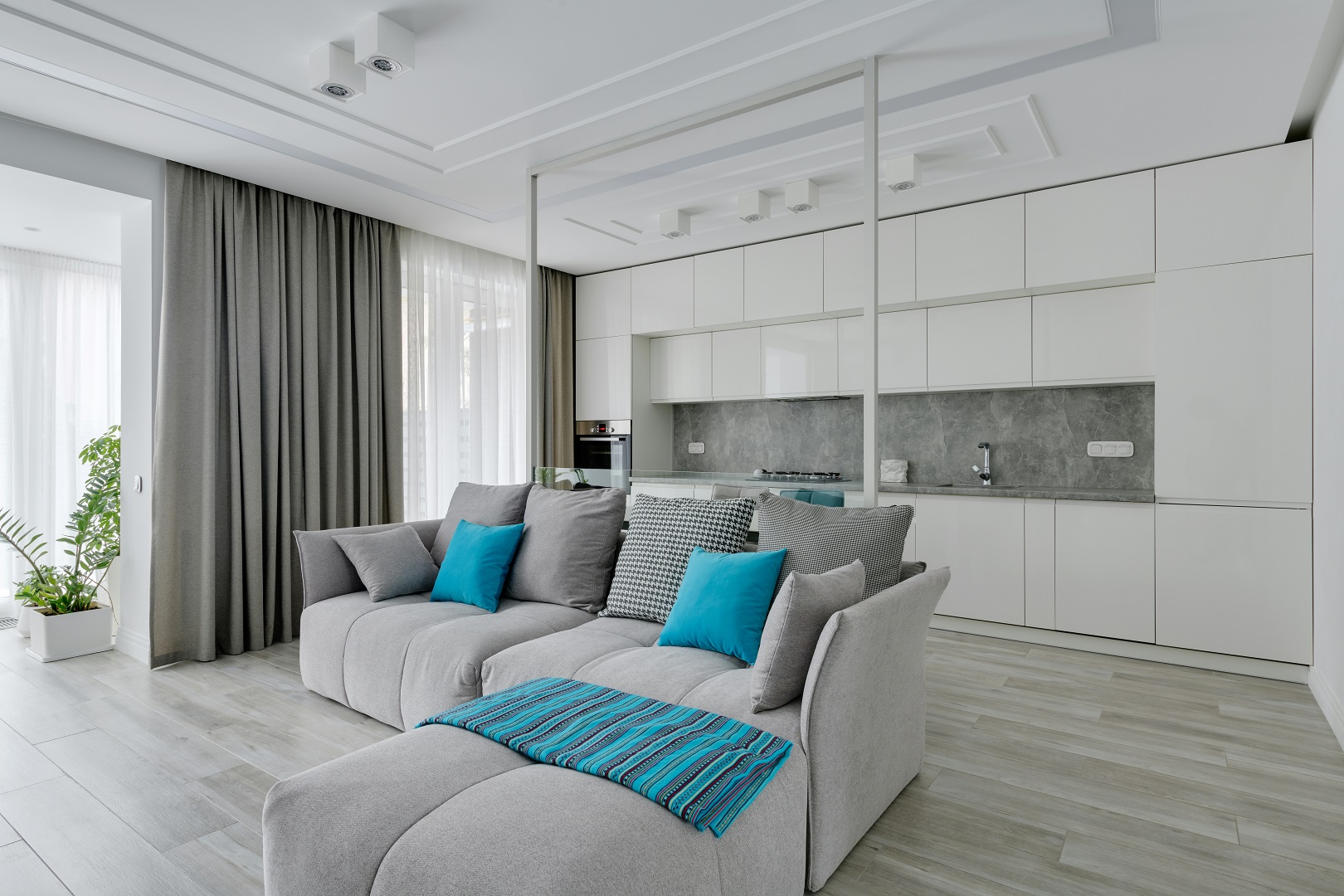 غرفة معيشة مودرن مفتوحة على المطبخ مع ستارة طويلة مصممة من طبقتين
