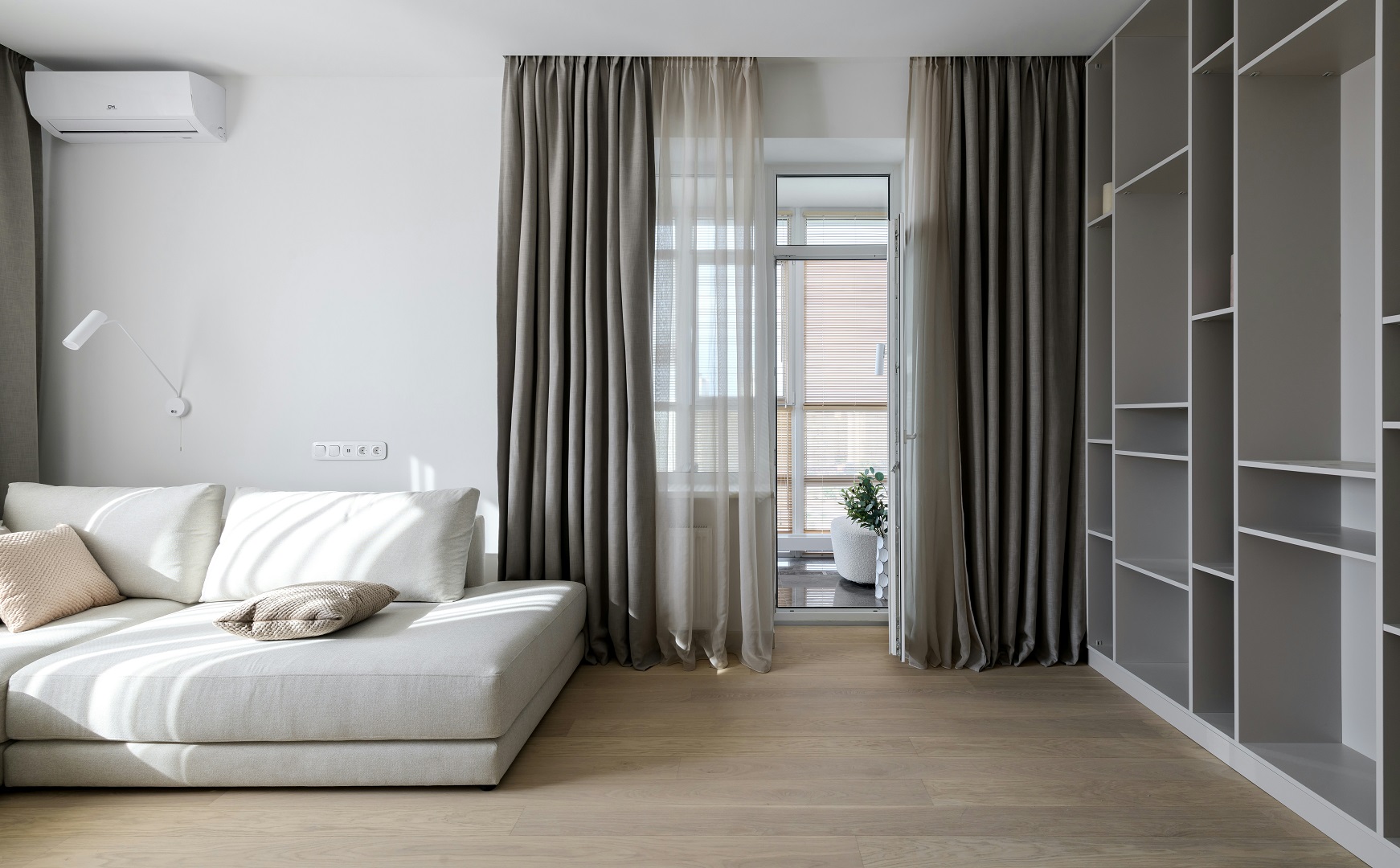 غرفة معيشة جميلة مع ستارة طويلة وكثيفة تتدلى حتى الأرضية وتجمل الديكور
