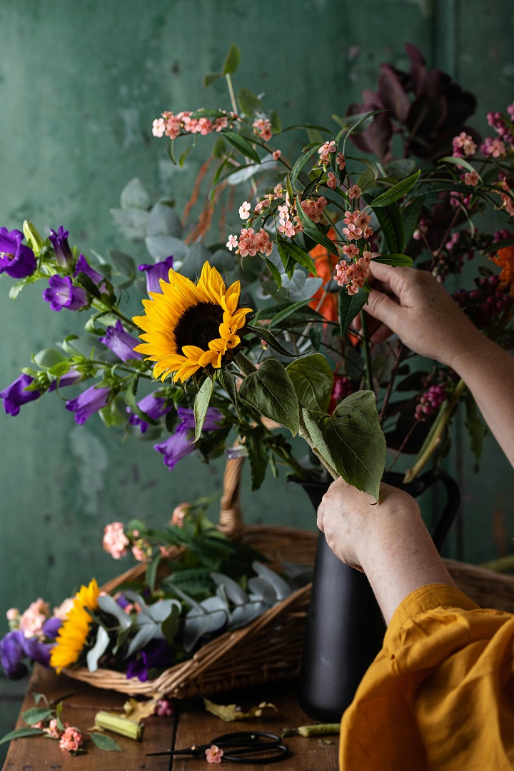 - ابدئي بوضع زهور عباد الشمس في المزهرية أولاً؛ ستكون هي النقطة المحورية، ثم أضيفي زهوراً أخرى بأطوال وأشكال مختلفة؛ لمزيد من العمق والجاذبية.