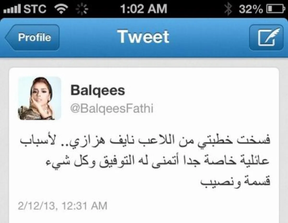 تفاعل المغردون مع تغريدة الفنانة بلقيس فتحي التي أعلنت فيها عبر حسابها الرسمي على تويتر فسخ خطوبتها من لاعب فريق الاتحاد والمنتخب السعودي نايف الهزازي بآراء متباينة، وباهتمام بالغ لم يقل عن خبر إعلان خطوبتهما سابقاً في أكتوبر الماضي.