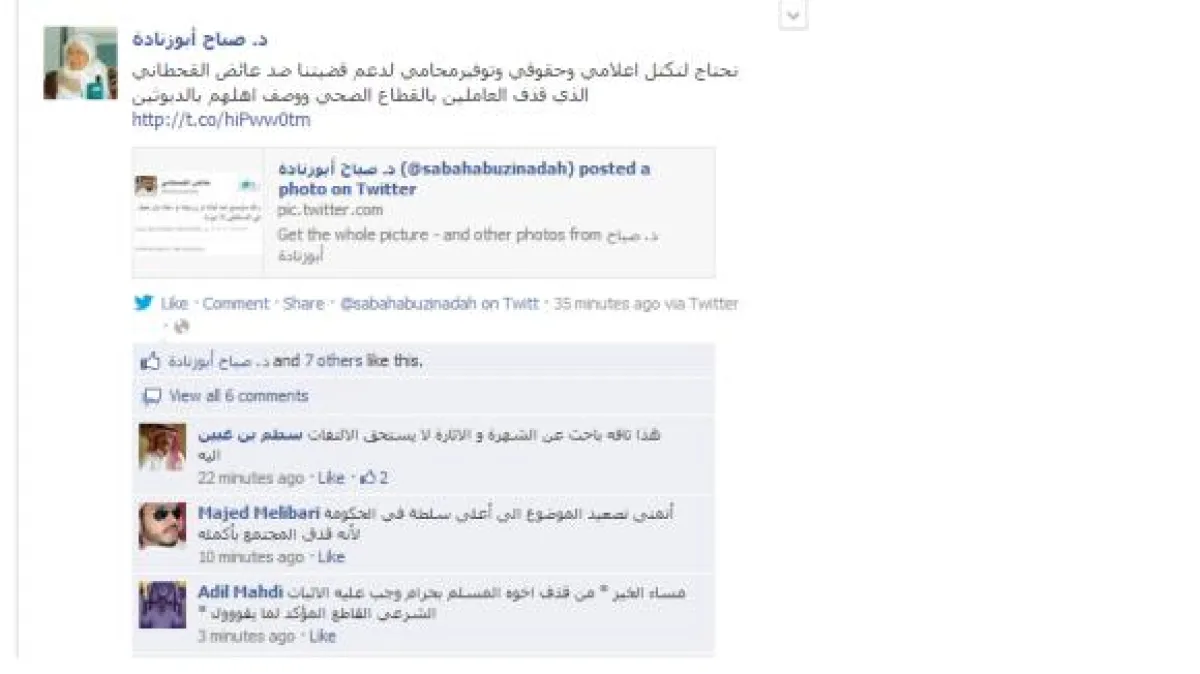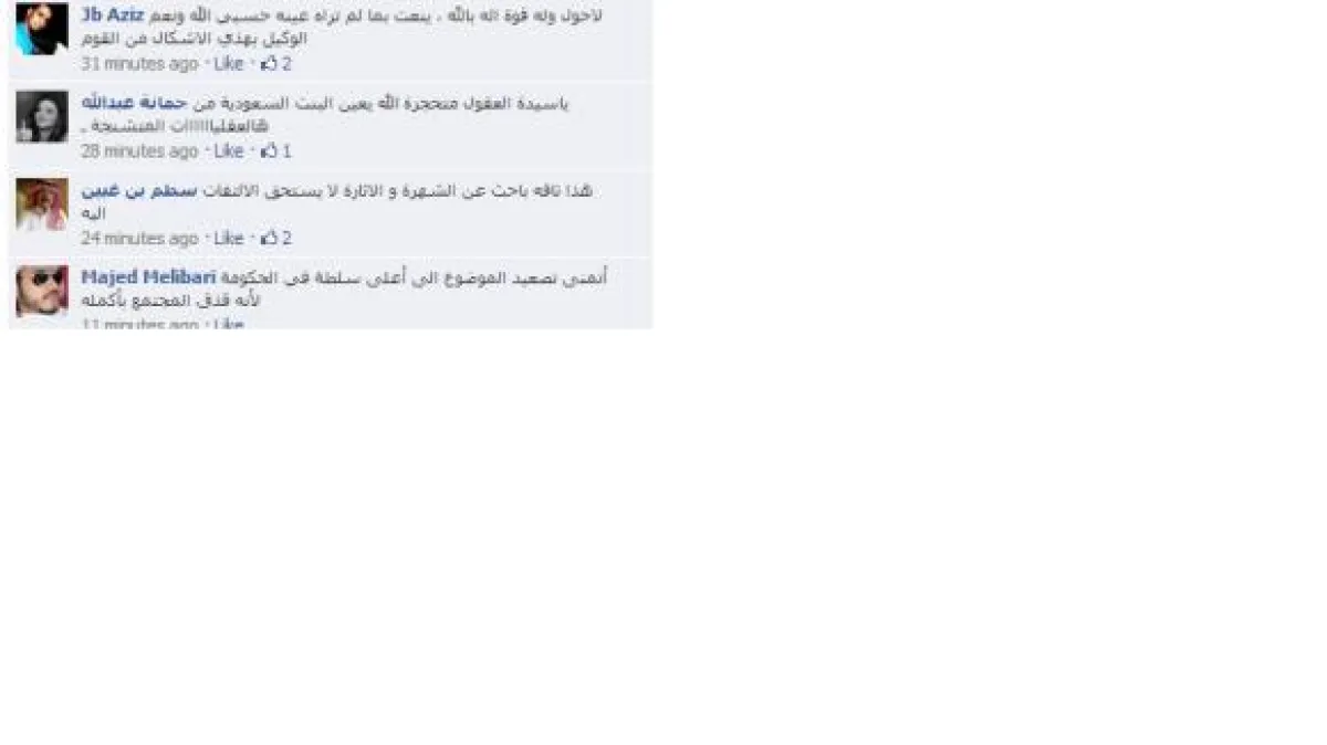 كما كتب Majed Melibari: "أتمنى تصعيد الموضوع إلى أعلى سلطة في الحكومة لأنه قذف المجتمع بأكمله"، وحول حرمة القذف كتب Adil Mahdi: "مساء الخير، من قذف أخوه المسلم بحرام وجب عليه الإثبات الشرعي القاطع المؤكد لما يقول".