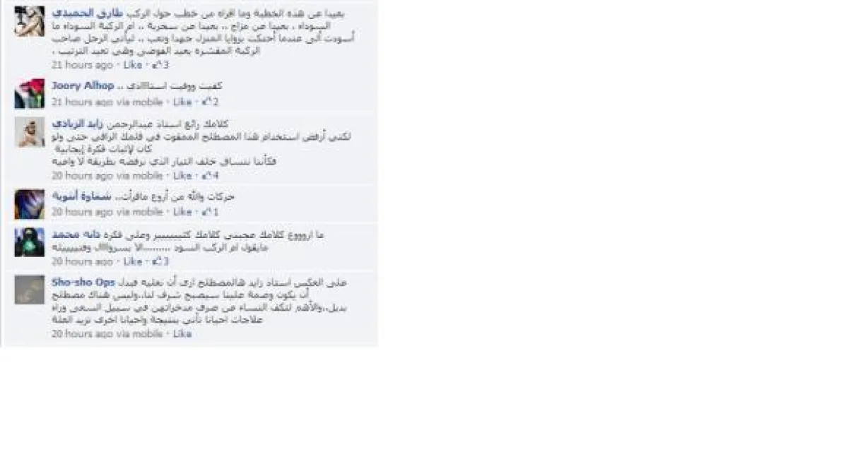 وعلق طارق الحميدي:" بعيداً عما أقرؤه من خطب حول الركب السوداء، بعيداً عن المزاح، بعيداً عن السخرية. أم الركبة السوداء ما اسودت إلا عندما احتكت بزوايا المنزل جهداً، وتعب ليأتي الرجل صاحب الركبة المقشرة يعيد الفوضى وهي تعيد الترتيب".
