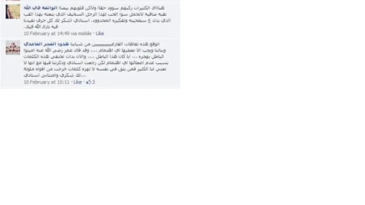 وكتب Abdullah Saad: "الله أكبر أليس من الإيمان ألا نسخر من بعضنا البعض ونكون سبباً في انتشار العقد النفسية لأناس سترهم الله بإيمانهم. أختي العزيزة ليس من أطلق هذه الصفات عليكِ إلا من سقط في براثن الساقطات وتجلت له النظرة لتلك العاريات اللاتي اتسخت قلوبهنّ قبل أجسادهنّ، وتصوروا بعقولهم أنّ تلك الصفات الخلقية هي صورة لتلك العفيفة التي صانت أطراف أظفارها عن التكشف فكيف ما بقي من جسدها هذه لمعظمهنّ.