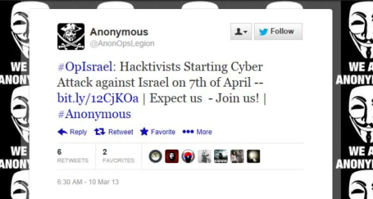 اليوم السابع من أبريل المقبل لن يكون يوماً اعتيادياً على شبكة الإنترنت، حيث هددت مجموعة Anonymous إسرائيل بمحوها عن شبكة الإنترنت، عن طريق تنفيذ هجوم سبراني مكثف، ما دفع بوزارة الدفاع الإسرائيلية لأخذ احتياطاتها الدفاعية تجاه هذه التهديدات.