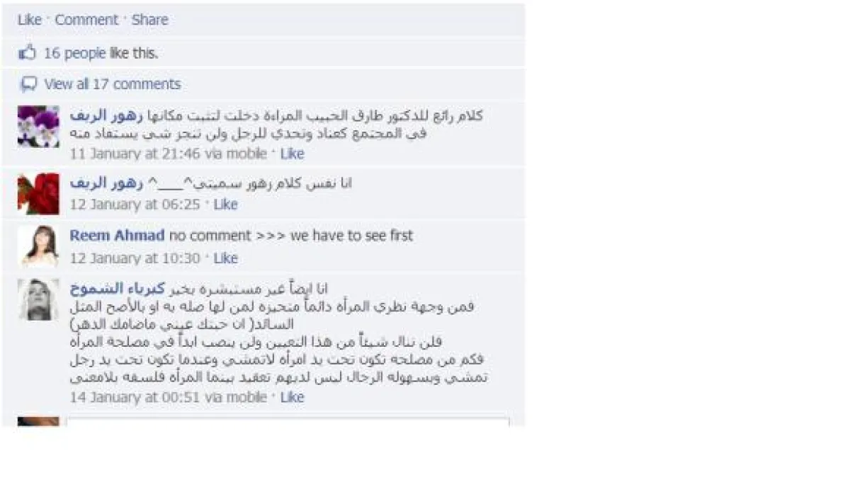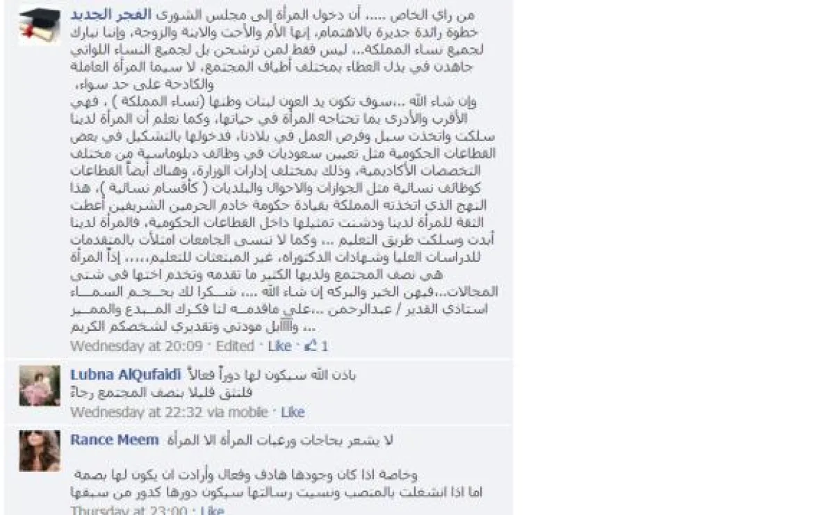 Somaya Hebshi علقت: سؤال مهم والله دايماً في بالي من يوم الخبر. أنا سيدة أعمال وبفكر يا ترى حتساعدني ولالا؟ ومع ذلك سعيدة بالخبر وحاسة أنها خطوة أولى حتى لو ماقدرت حيجو الدفعه التانية ويعملو الخطوه التالية.. ورأت من أسمت نفسها يالله ياقلبي: أعتقد الخطوة ستكون فارقة، وأعتقد أنّ أول قرار راح يناقشونه قيادة المرأة للسيارة..