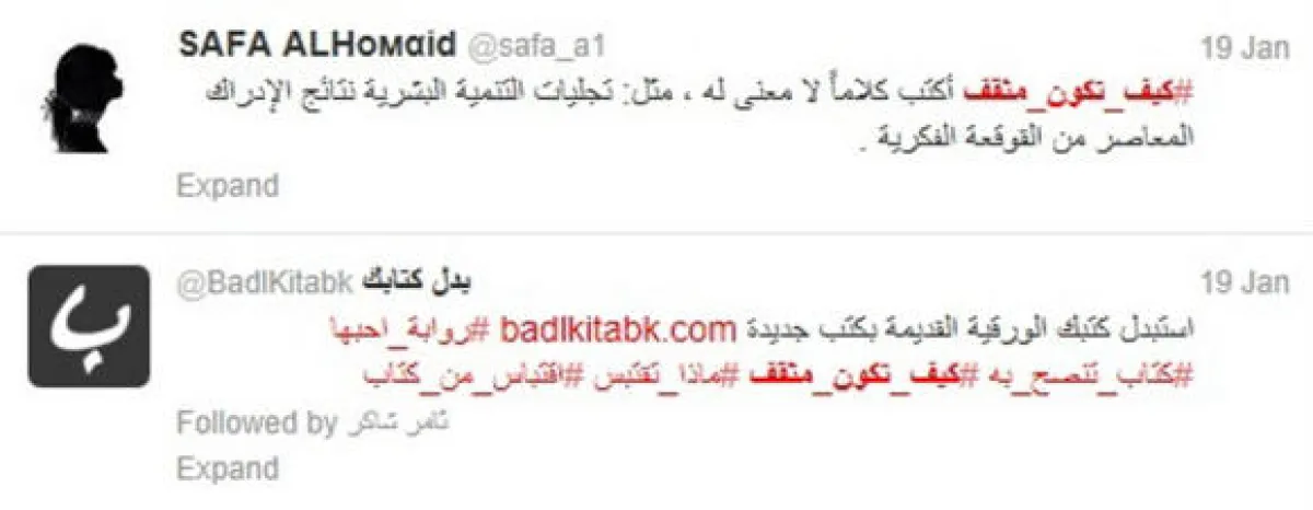 وهذا ما أكدته إجابات المغردين على صفحاتهم. فمثلاً قالت @ 2012 joda على هاشتاق «كيف_تصنع_ مثقفاً؟»: «ألوِّن صورتي بالأبيض والأسود. أكتب كلاماً لا معنى له، مزخرفاً بضمة من هنا، وفتحة من هناك.. إذاً أنا مثقف»، فيما قال @ badlkitabk «أستبدل بكتبي الورقية كتباً جديدة».