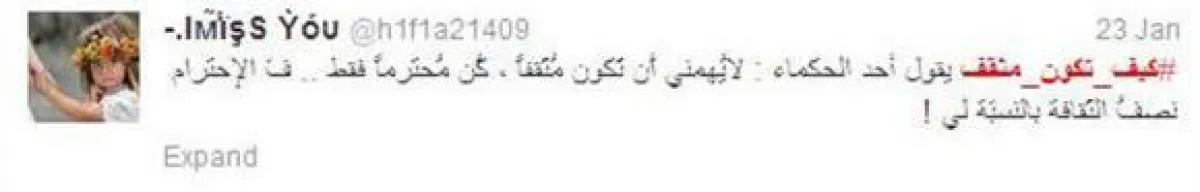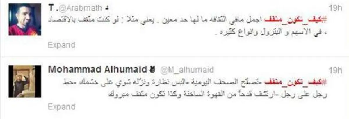 وخلص @ h1f1a21409 إلى قول أحد الحكماء: «يهمني أن تكون مثقفاً.. كُنْ محترماً فقط، فالاحترام نصف الثقافة بالنسبة لي». في حين قالت @ safa_a1 إن الطريقة المثلى؛ لكي تكون مثقفاً هي: «اكتب كتاباً لا معنى له مثل تجليات التنمية البشرية.. نتائج الإدراك المعاصر من القوقعة الفكرية».