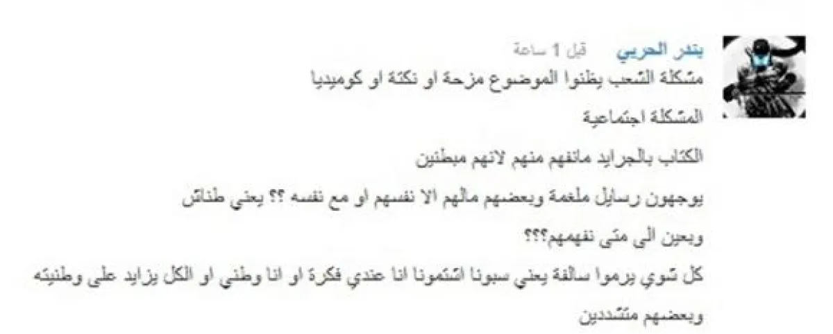 في هذا الإطار رصد «سيدتي نت» تعليقات مشاهدي سكتش «مثقفجي» على «يوتيوب». مثلاً كتب بندر الحربي ناقداً كيفية صناعة المثقف في العالم العربي قائلاً: «مشكلة الشعب يظنون الموضوع مزحة أو نكتة أو كوميديا. هي مشكلة اجتماعية».للاطلاع على سكتش «مثقفجي» من برنامج «مسامير»: