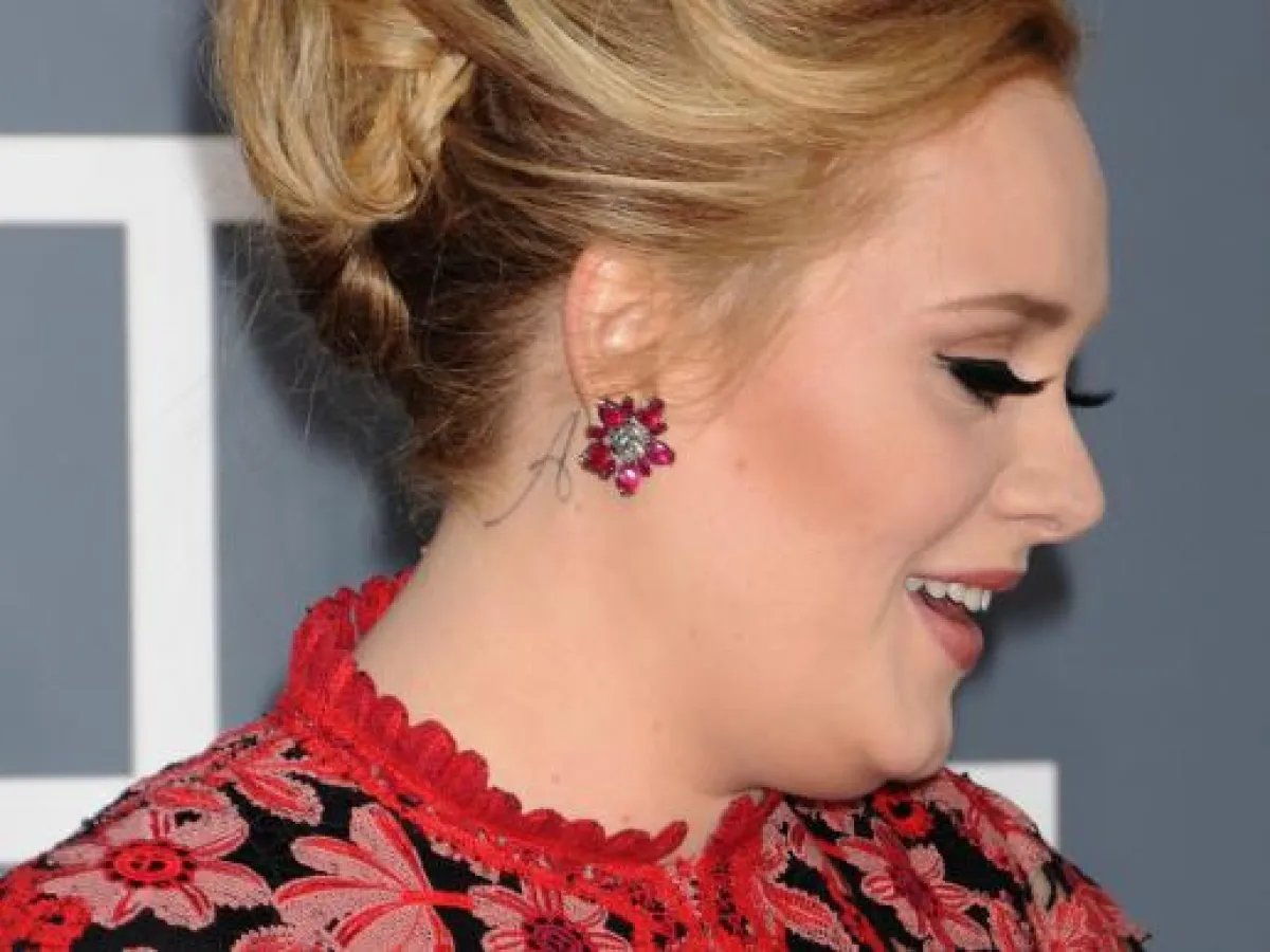تألقت النجمة البريطانية أديل خلال حضورها حفل توزيع جوائز "غرامي" في لوس أنجلس بثوب مورد من تصميم فالنتينو ، لكن ما لفت الانتباه لم يكن مظهرها وملابسها فحسب بل وشم جديد لحرف "A" خلف أذنها .