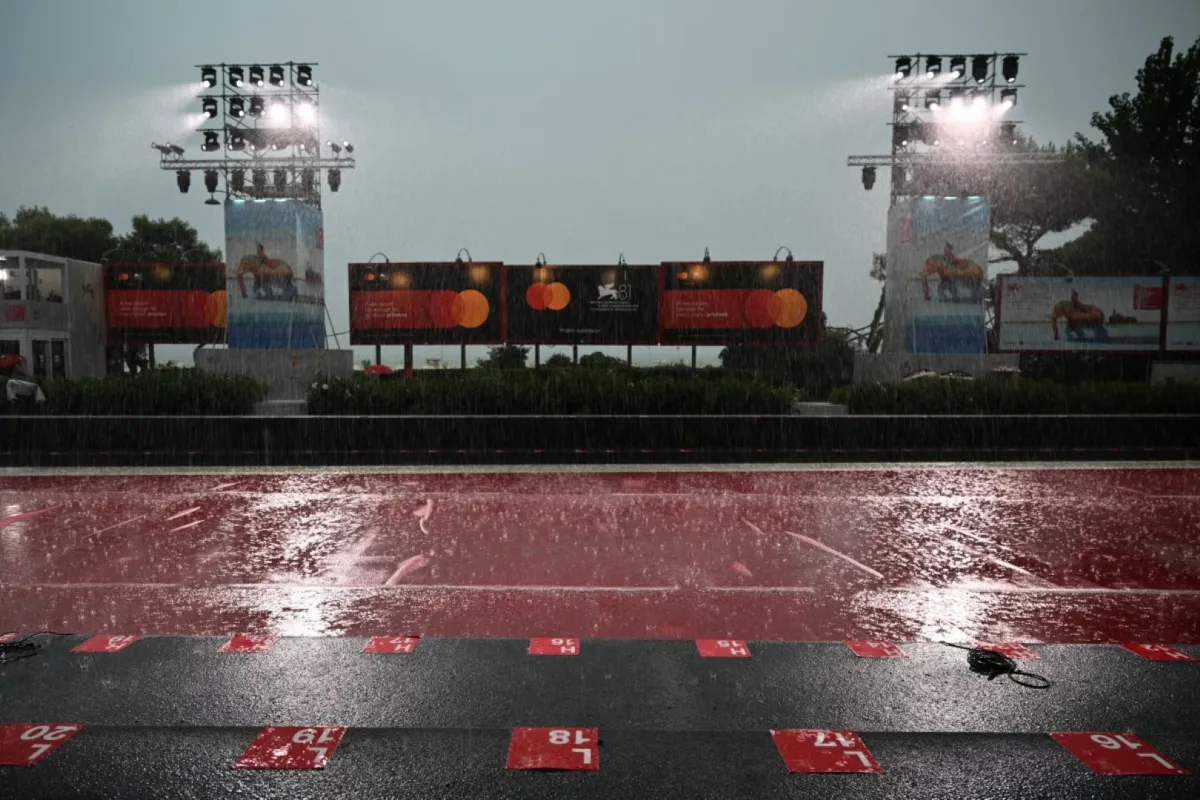 ويعود سبب هذا الأمر إلى العاصفة الرعدية القوية التي ضربت مدينة البندقية اليوم الخميس مما أجبر المُمثلين وصانعي الأفلام على الفرار من السجادة الحمراء والتي غمرتها الأمطار الغزيرة.