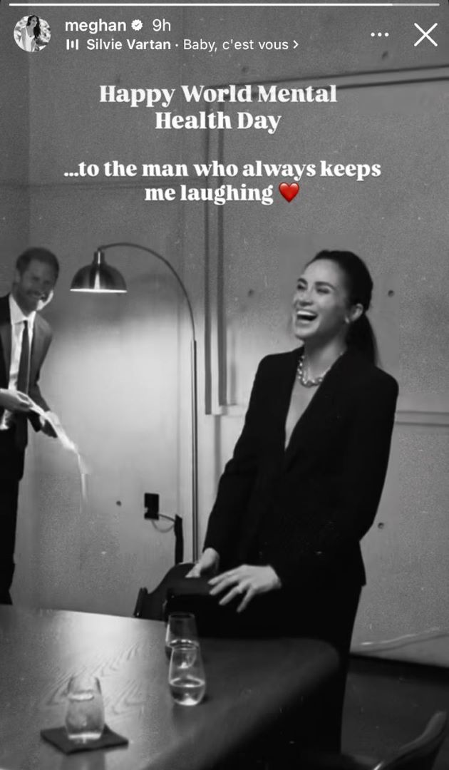 شاركت ميغان ماركل مقطع فيديو بالأبيض والأسود عبر ستوري قصص إنستغرام الخاص بها، على أنغام أغنية سيلفي فارتان "Baby, c'est vous"، حيث ظهرت ميغان وهي تضحك على نكتةٍ أطلقها الأمير هاري، وكتبت على الفيديو: "يوم عالمي سعيد للصحة النفسية... للرجل الذي يُبقيني أضحك دائمًا".