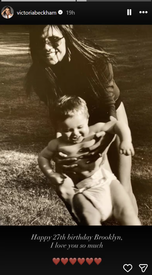 من جانبها، أعادت فيكتوريا بيكهام نشر الصورة العائلية نفسها عبر حسابها وكتبت: "يوم ميلاد سعيد بروكلين، نحن نحبك كثيراً"، كما شاركت صورة أخرى بالأبيض والأسود وهي تحمل ابنها عندما كان رضيعاً.