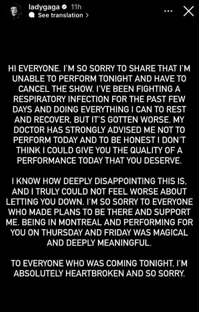 وفقاً لما شاركته ليدي غاغا، عبر ستوري حسابها الخاص على إنستغرام، فقد أعلنت اضطرارها لإلغاء حفلها الثالث والأخير، في مركز بيل في مونتريال، كيبيك، بجولتها العالمية "مايهيم بول"؛ بسبب إصابتها بعدوى تنفسية.