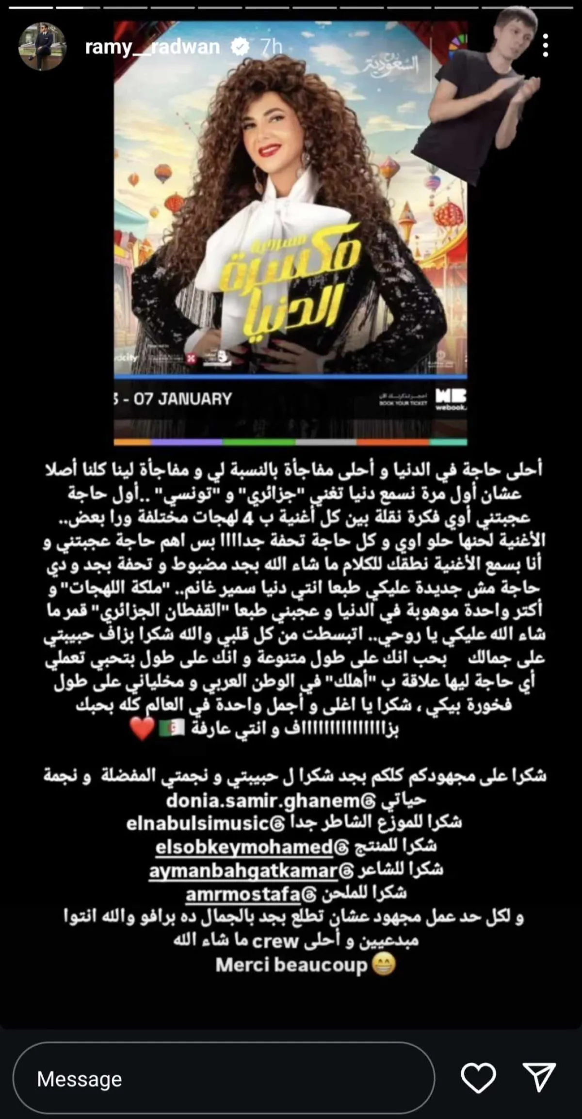 وفي سياقٍ متصل، تعمل دنيا سمير غانم على التحضيرات الأخيرة الخاصة بمسلسلها الجديد "عايشة الدور" الذي تخوض به منافسات موسم دراما رمضان 2025، حيث يُجرَى حالياً التعاقد مع الفنانين المشاركين في البطولة، وانضم لفريق العمل كل من محمد ثروت وسما إبراهيم، والعمل من تأليف أحمد الجندي، وكريم يوسف وإخراج أحمد الجندي.لمشاهدة أجمل صور المشاهير زوروا «إنستغرام سيدتي».