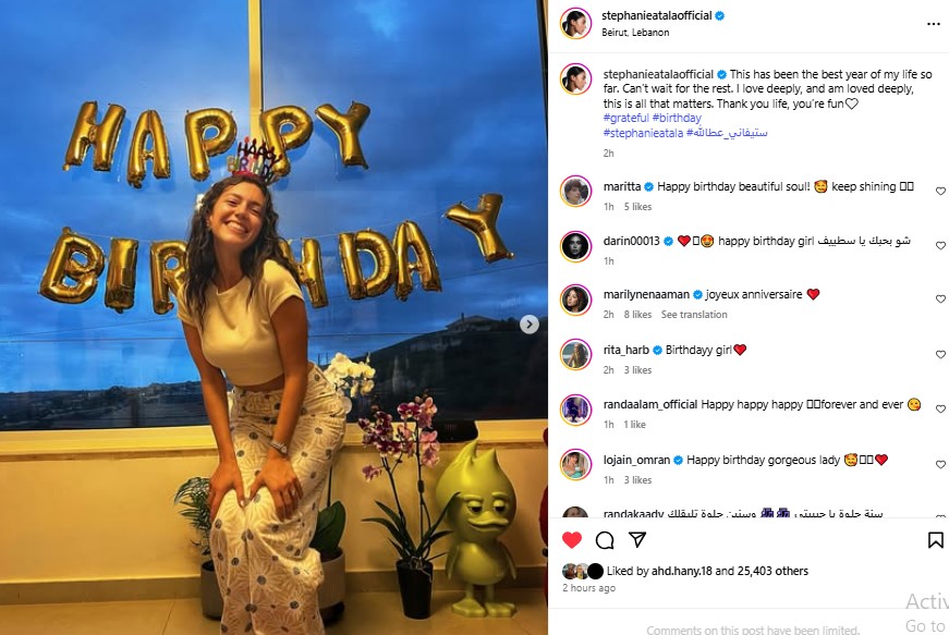 وجاء تعليق ستيفاني عطا الله معبراً عن امتنانها وسعادتها؛ إذ وصفت العام الماضي بأنه الأفضل في حياتها حتى الآن، مشيرة إلى تطلعها لما هو قادم بكل حماس وشوق قائلة: "لقد كان هذا أفضل عام في حياتي حتى الآن، أتطلع بشوق للباقي، أُحِب بعمق، وأُحَب بعمق، هذا كل ما يهم، شكراً لكِ يا حياة، أنتي ممتعة".