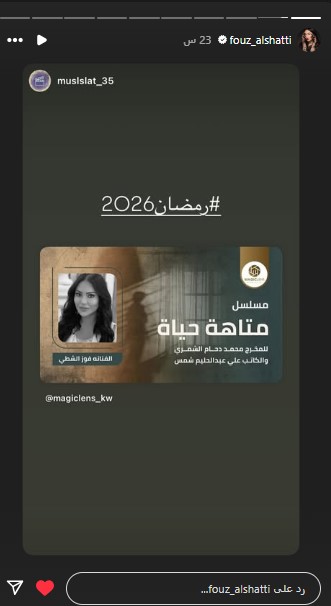 ونشرت النجمة فوز الشطي، عبر خاصية "الاستوري" التابعة لحسابها الرسمي على "إنستغرام"، صورة على شكل كارت تعريفي، ظهرت فيه صورتها بحجم صغير في أحد جوانبه، فيما تصدر الكارت اسم مسلسلها الرمضاني الجديد "متاهة حياة"، إلى جانب اسم المؤلف والمخرج.