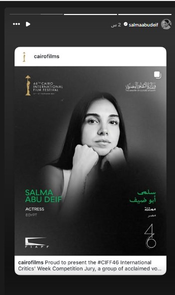 أما النجمة سلمى أبو ضيف، فسوف تكون ضمن أعضاء لجنة تحكيم مسابقة أسبوع النقاد في الدورة الـ 46 من مهرجان القاهرة السينمائي الدولي.