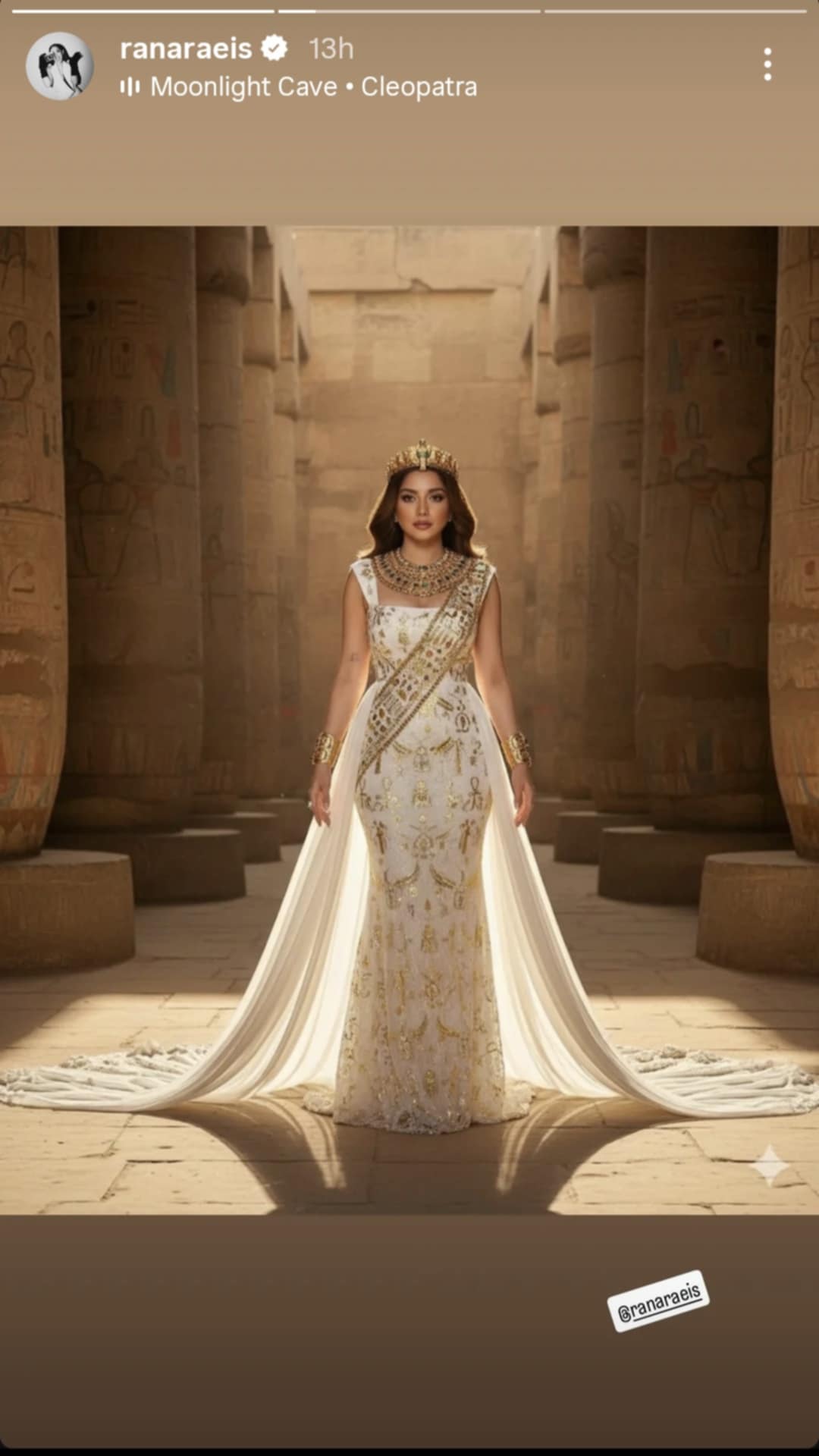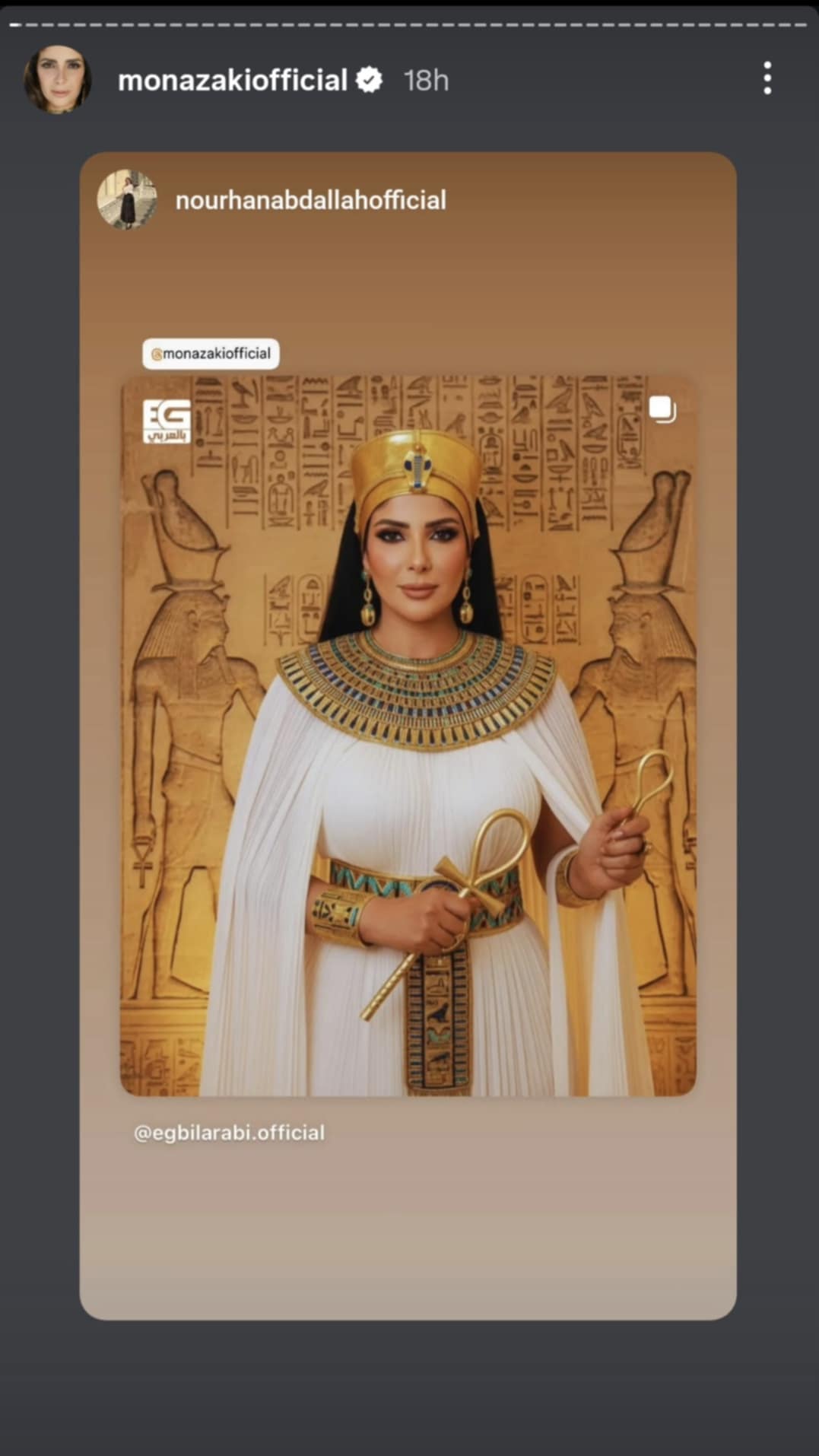 هنا شيحة أيضاً خاضت هذه التجربة، ونشرت صورتها بالزي الفرعوني، وكتبت تعليقاً: "حين يتنفس التراث... يتوقف الزمن أقف في قلب التاريخ، حيث يُنحت الأبد في الحجر، وحيث يتدفق الجمال من ضوء الحضارة إلى روح الحاضر".