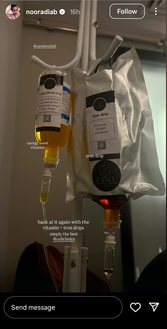 نشرت نور عمرو دياب صورة من خلال خاصية القصص القصيرة بحسابها الشخصي على موقع الصور والفيديوهات "إنستغرام"؛ وذلك بعد تعرضها لوعكة صحية نُقلت على إثرها لإحدى المستشفيات، وأظهرت الصورة تلقيها لمحاليل الفيتامينات والحديد. وعلقت نور على الصورة قائلة: "عدت من جديد مع قطرات الفيتامينات والحديد، الأفضل على الإطلاق".