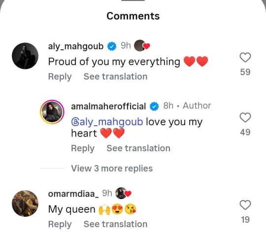 ليفاجئ رجل الأعمال علي محجوب الفنانة ومتابعيها بتعليق رومانسي على الصور، قائلاً: "فخور بكِ يا كل شيء بالنسبة لي"، لترد عليه أمال ماهر، قائلة: "أحبك يا قلبي"، وتعدّ هذه أولى الرسائل والتفاعل العلني بين الثنائي، بعد تردد الأنباء بزواجهما.