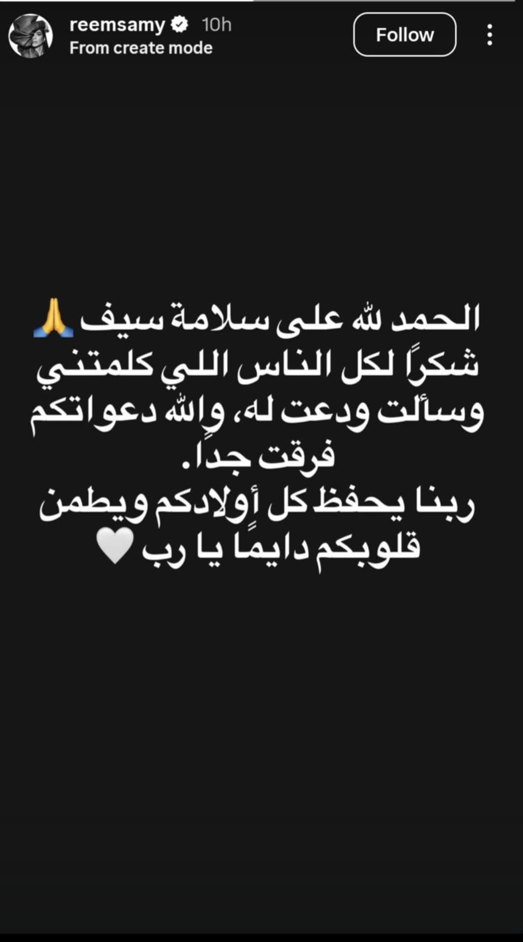 خرجت ريم سامي عن صمتها وتحدثت بنفسها كاشفه آخر التطورات في شأن نجلها، وذلك عبر ستوري حسابها الرسمي على إنستغرام، حيث طمأنت متابعيها قائلة: "الحمد لله على سلامة سيف شكرًا لكل الناس اللي كلمتني وسألت ودعت له، والله دعواتكم فرقت جدا. ربنا يحفظ كل أولادكم ويطمن قلوبكم دايما يا رب".وقد تفاعل عدد كبير من متابعيها مع هذا الخبر، وتمنوا لنجلها دوام الصحة والعافية وأن تكون حالته الصحية على ما يرام، وطالبها الجميع بالعناية بطفلها خاصةً في الفترة الأولى التي يزداد فيها الخطر حوله بسبب عدم قدرته على التحكم في جسده بشكلٍ كامل.