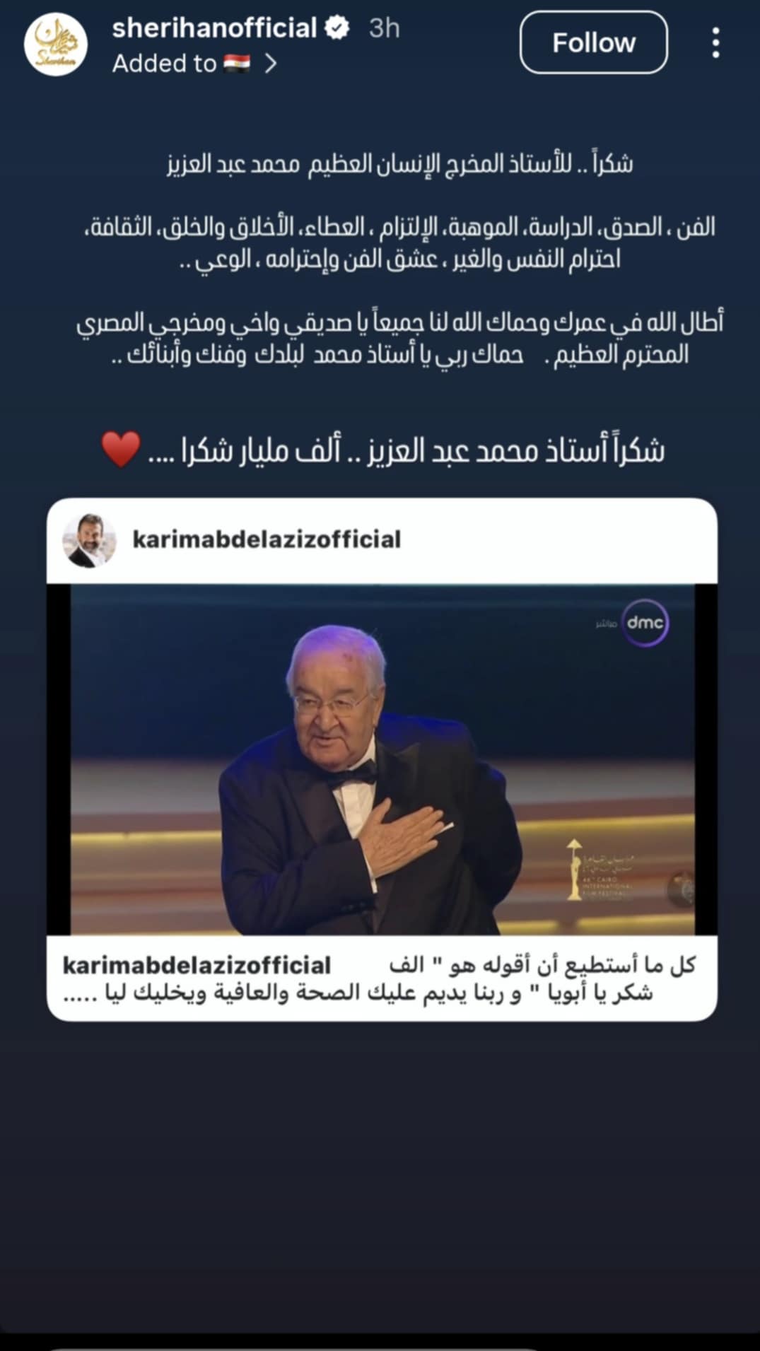 نشرت شريهان عبر خاصية ستوري حسابها الرسمي على إنستغرام صورة تكريم المخرج عبد العزيز في المهرجان وقالت نصا "شكرًا للأستاذ المخرج الإنسان العظيم محمد عبد العزيز، الفن، الصدق، الدراسة، الموهبة، الالتزام، العطاء، الأخلاق، الثقافة، احترام النفس والغير، عشق الفن واحترامه، والوعي".