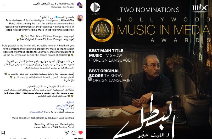 حصدت المؤلفة الموسيقية سعاد بشناق ترشيحين لجوائز هوليوود للموسيقى في الإعلام (HMMA)، في فئتي أفضل موسيقى شارة بداية وأفضل موسيقى تصويرية أصلية لمسلسل تليفزيوني غير ناطق بالإنجليزية، وذلك عن موسيقاها في مسلسل "البطل".