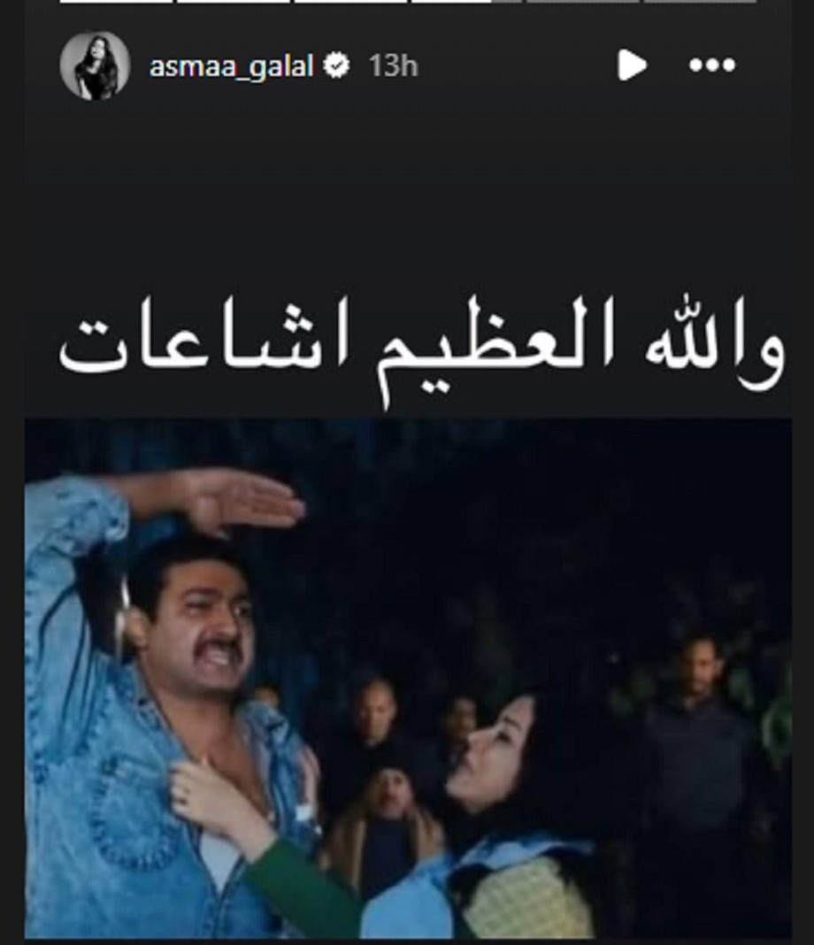 حيث شاركت أسماء جلال من خلال خاصية القصص القصيرة عبر حسابها الشخصي على موقع الصور والفيديوهات "إنستغرام"؛ صورة للفنان ياسر جلال والفنانة جومانا مراد من فيلم "الفرح"؛ وأرفقت الصورة بتعليق "والله العظيم إشاعات".