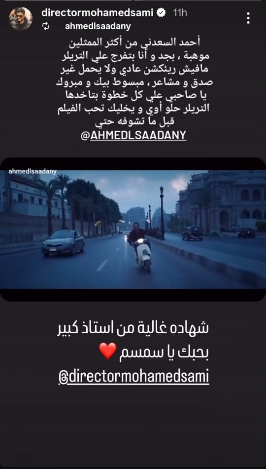 ليقوم أحمد السعدني بإعادة نشر إشادة سامي من خلال حسابه ويعلق قائلاً : "شهادة غالية من أستاذ كبير بحبك يا سمسم".