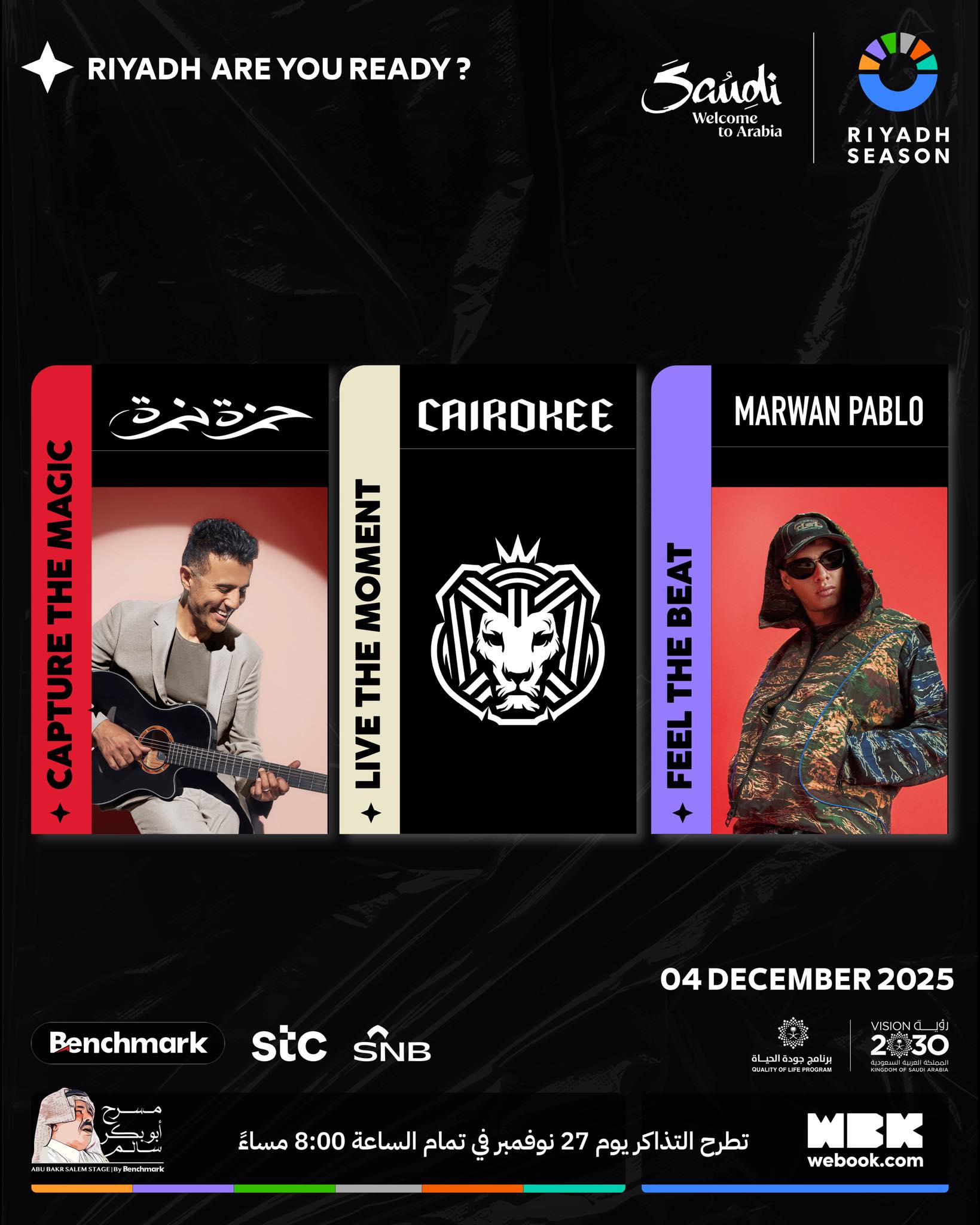 ويضم الحفل المرتقب، الثلاثي حمزة نمرة، و"كايروكي" باند، وكذلك مغني الراب مروان بابلو، يوم 4 ديسمبر المقبل، ومن المُقرر أنّ يشهد العديد من المفاجآت والفقرات الغنائية المتنوعة، حيث سيُفتح باب حجز التذاكر إلكترونيًا، اعتبارًا من اليوم الخميس في تمام الساعة الثامنة مساءً، عبر الموقع الرسمي للشركة المنظمة.