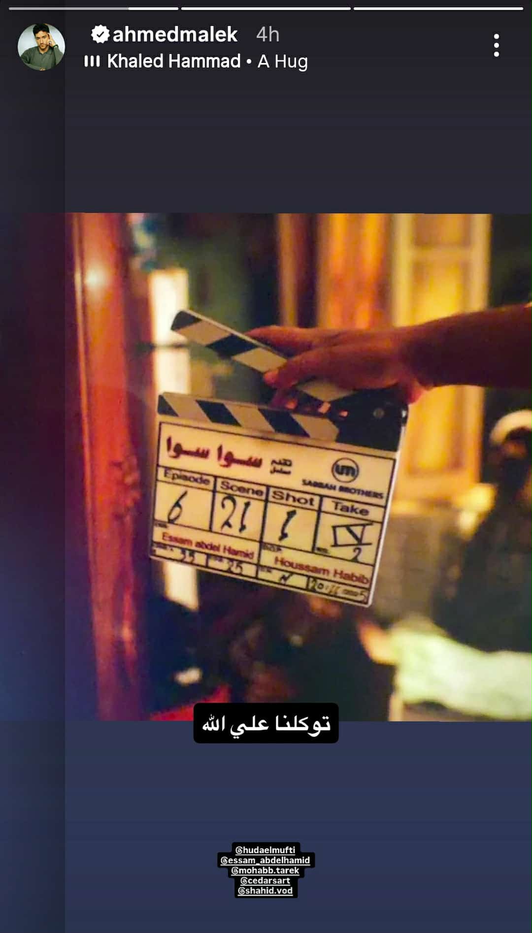 كما يواصل الفنان أحمد مالك، نجاحاته في عالم الدراما التلفزيونية، حيث بدأ تصوير مسلسله الجديد "سوا سوا"، اليوم السبت، داخل أحد البلاتوهات بالقاهرة، حيث نشر صورة من الكواليس، عبر خاصية الـ"ستوري" على "إنستغرام"، وعلق عليها بقوله: "توكلنا على الله".