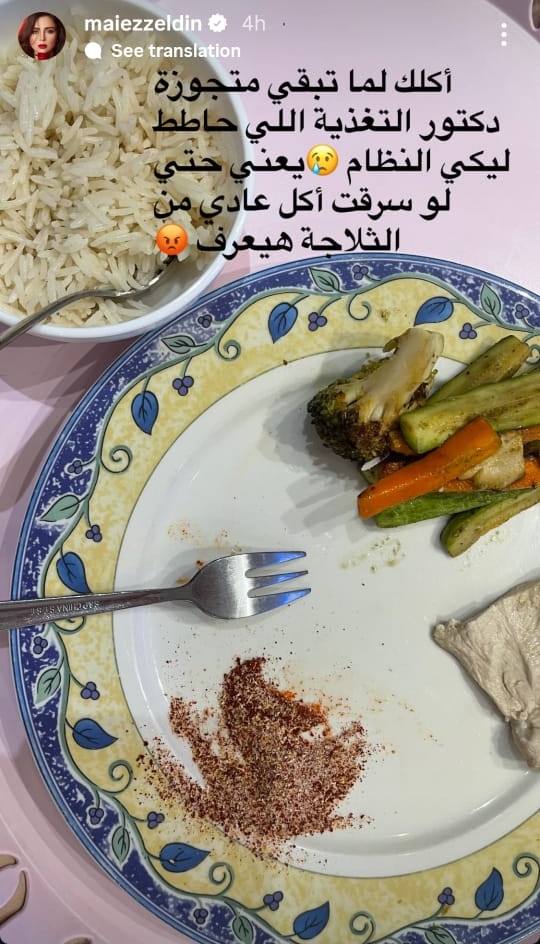 كشفت النجمة مي عز الدين عن خضوعها لنظام غذائي صارم بهدف إنقاص وزنها؛ تحت إشراف زوجها دكتور التغذية أحمد تيمور؛ حيث شاركت النظام ومازحت جمهورها وذلك من خلال صورة عبر خاصية القصص القصيرة بحسابها الشخصي على "إنستغرام".