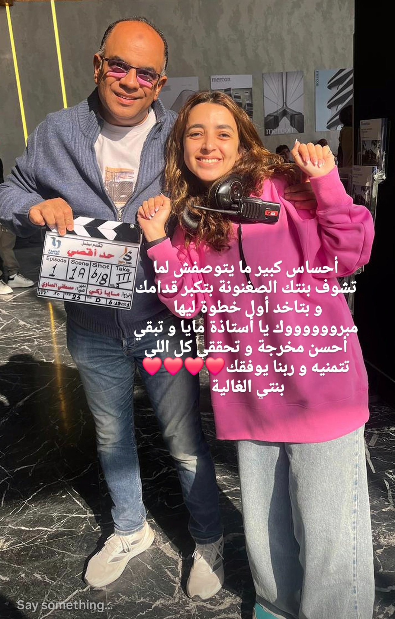 وقال المخرج هاني يسري: "إحساس كبير ما يتوصفش لما تشوف بنتك الصغنونة بتكبر قدامك وبتاخد أول خطوة ليها". متابعاً: "مبروك يا أستاذة مايا، وتبقي أحسن مخرجة، وتحققي كل اللي تتمنيه وربنا يوفقك، ابنتي الغالية".