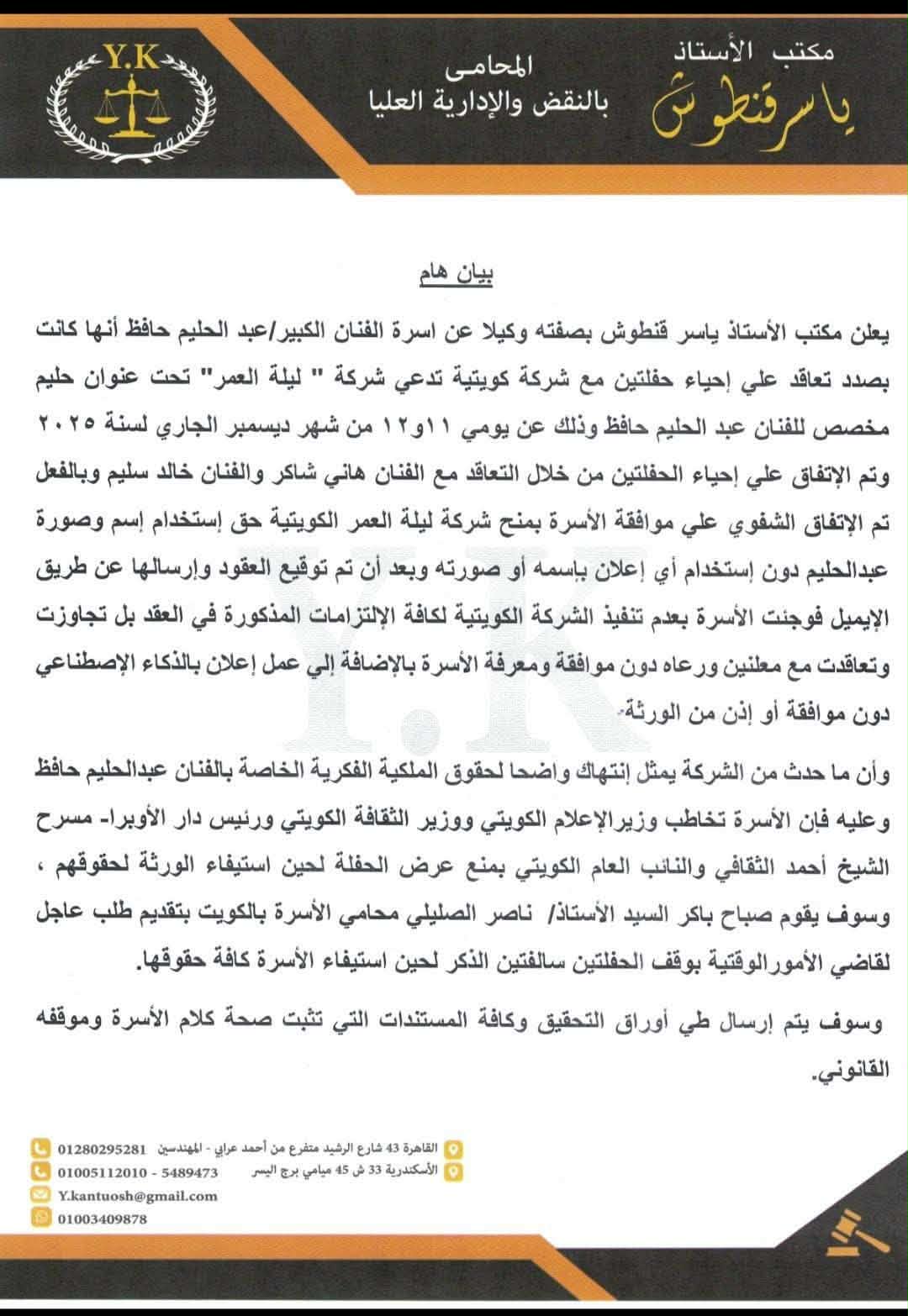 ورأت الأسرة أنّ "ما حدث من الشركة يمثل انتهاكًا واضحًا لحقوق الملكية الفكرية الخاصة بالفنان عبد الحليم حافظ، لذا نخاطب وزير الإعلام الكويتي، ووزير الثقافة الكويتي، ورئيس دار الأوبرا – مسرح الشيخ أحمد الثقافي، والنائب العام الكويتي، بمنع عرض الحفلة لحين استيفاء الورثة لحقوقهم".وشددت على أنّ "محامي الأسرة في الكويت، سيتقدم بطلب عاجل لقاضي الأمور الوقتية بوقف الحفلتين، لحين استيفاء الأسرة كافة حقوقها، وسوف يتم إرسال أوراق التحقيق وكافة المستندات التي تثبت صحة كلام الأسرة وموقفها القانوني".