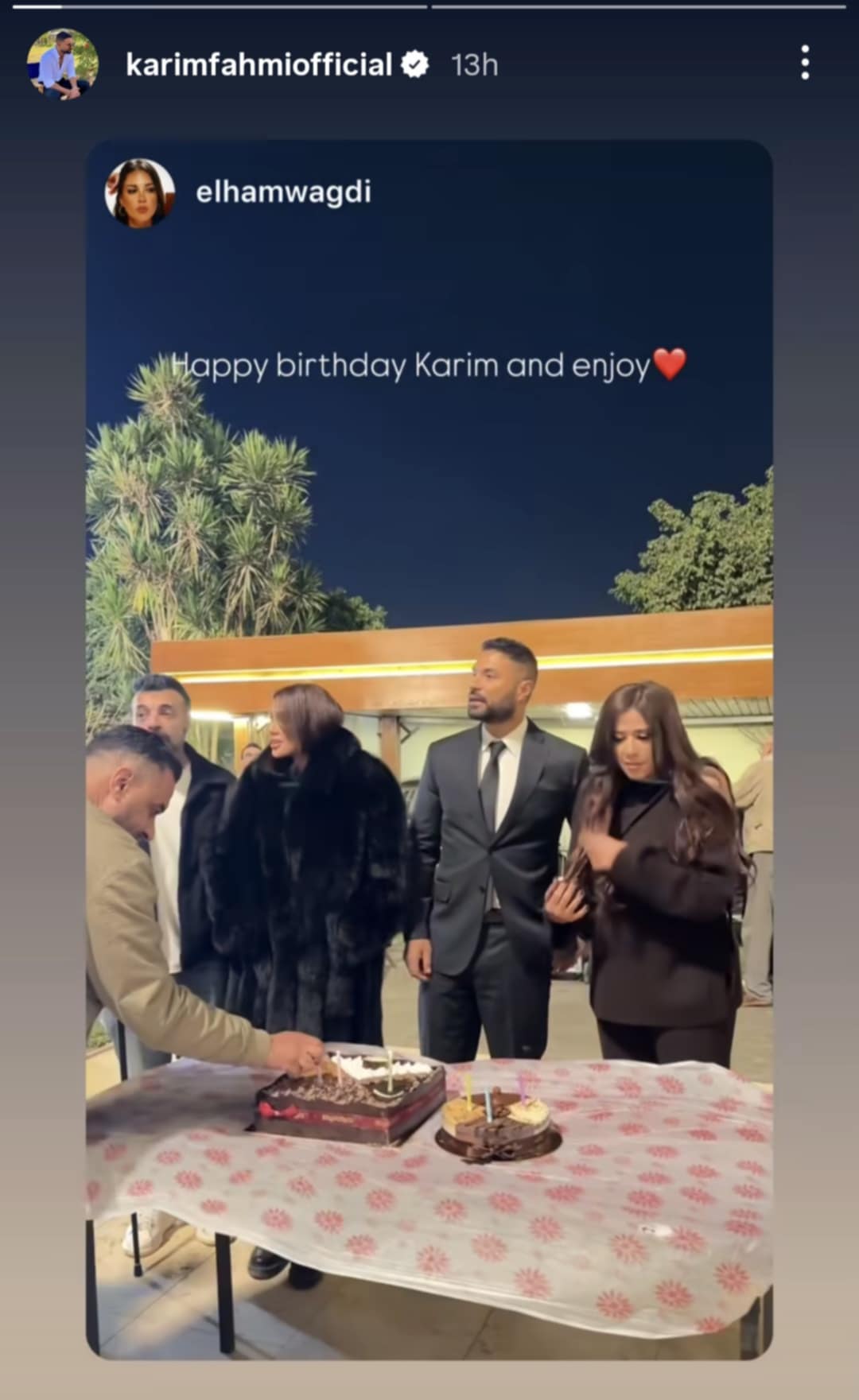 شارك الفنان كريم فهمي جمهوره ومحبيه عبر ستوري حسابه الشخصي على موقع الصور والفيديوهات إنستغرام مقطع مصور تواجد فيه بجانب ياسمين عبد العزيز وهي تحتفل بيوم ميلاده، وباقي صناع العمل يغنون أغاني يوم الميلاد الشهيرة، ويقطعون قالب حلوى كبير وسط أجواء من السعادة بين الحضور.