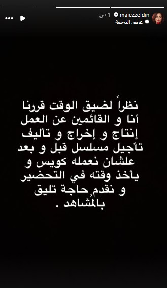 يشار إلى أن الفنانة مي عز الدين، أعلنت أمس الثلاثاء 16 ديسمبر، عن خروج مسلسلها الجديد "قبل وبعد" من السباق الدرامي الرمضاني 2026، موضحة أن القرار جاء بسبب ضيق الوقت، الذي يقف عائقاً أمام رغبة القائمين على العمل في تقديم مسلسل يليق بتوقعات المشاهدين بالشكل الذي يرضيهم.وكتبت مي عز الدين، منشوراً عبر خاصية ستوري حسابها الرسمي على "إنستغرام"، جاء مضمونه كالتالي: "نظراً لضيق الوقت قررنا أنا والقائمون عن العمل إنتاج وإخراج وتأليف، تأجيل مسلسل قبل وبعد، علشان نعمله كويس ويأخذ وقته في التحضير ونقدم حاجة تليق بالمشاهد".