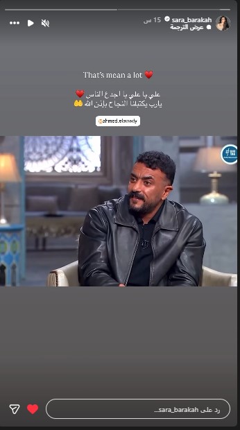 لتعبّر سارة بركة عن سعادتها بتقديم العوضي لها بهذه الطريقة؛ لتقوم بالرد عليه بنشر مقطع فيديو قصير من حواره عبْر خاصية الـ ستوري التابعة لحسابها الرسمي على "إنستغرام"، وعليه عبارة جاء مضمونها: "علي يا علي يا أجدع الناس، يارب يكتبلنا النجاح بإذن الله".